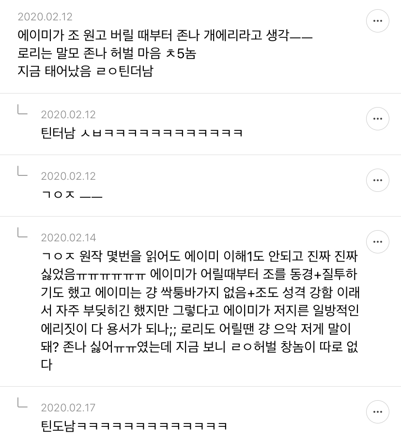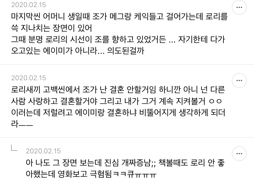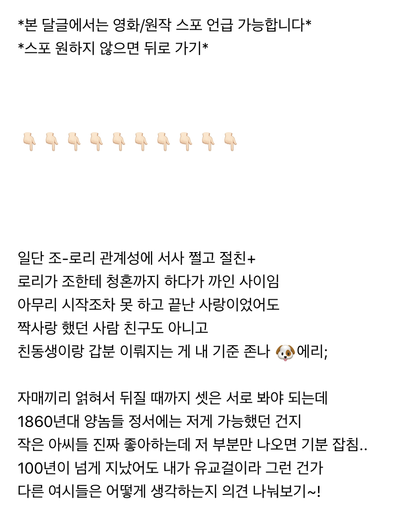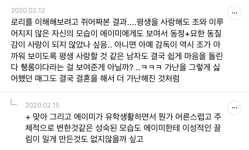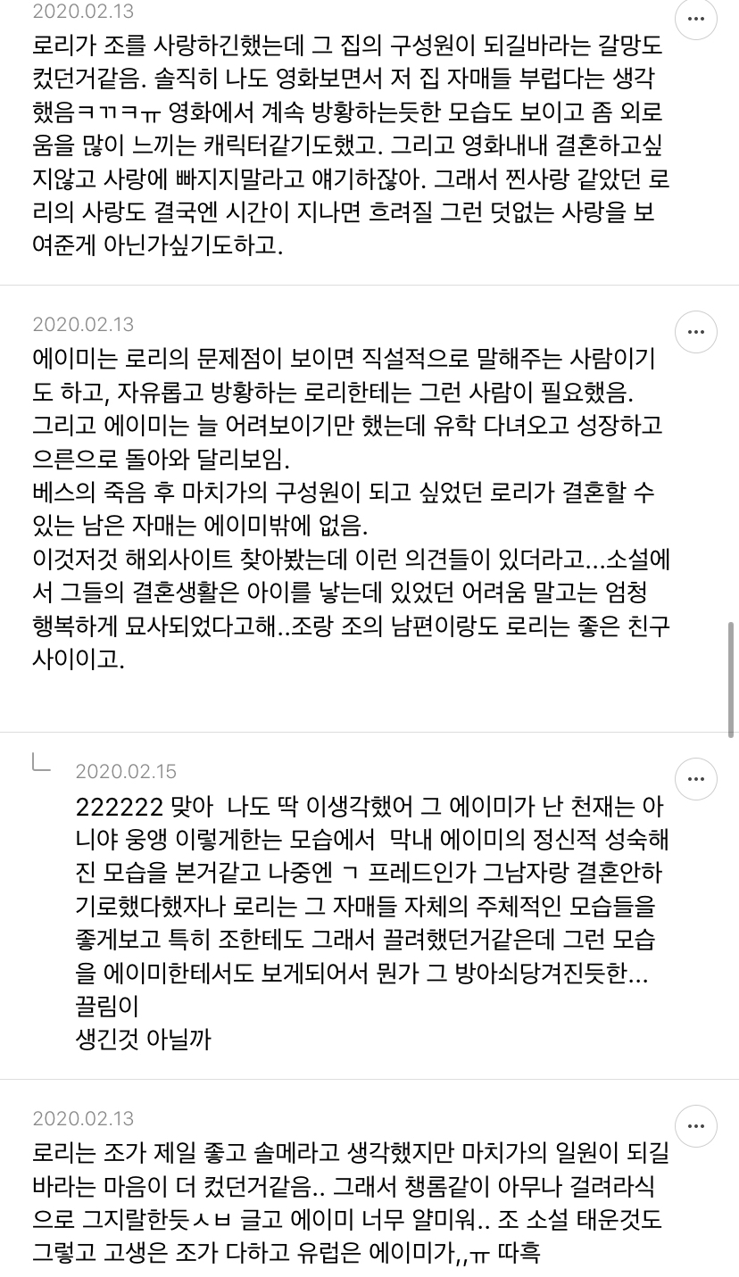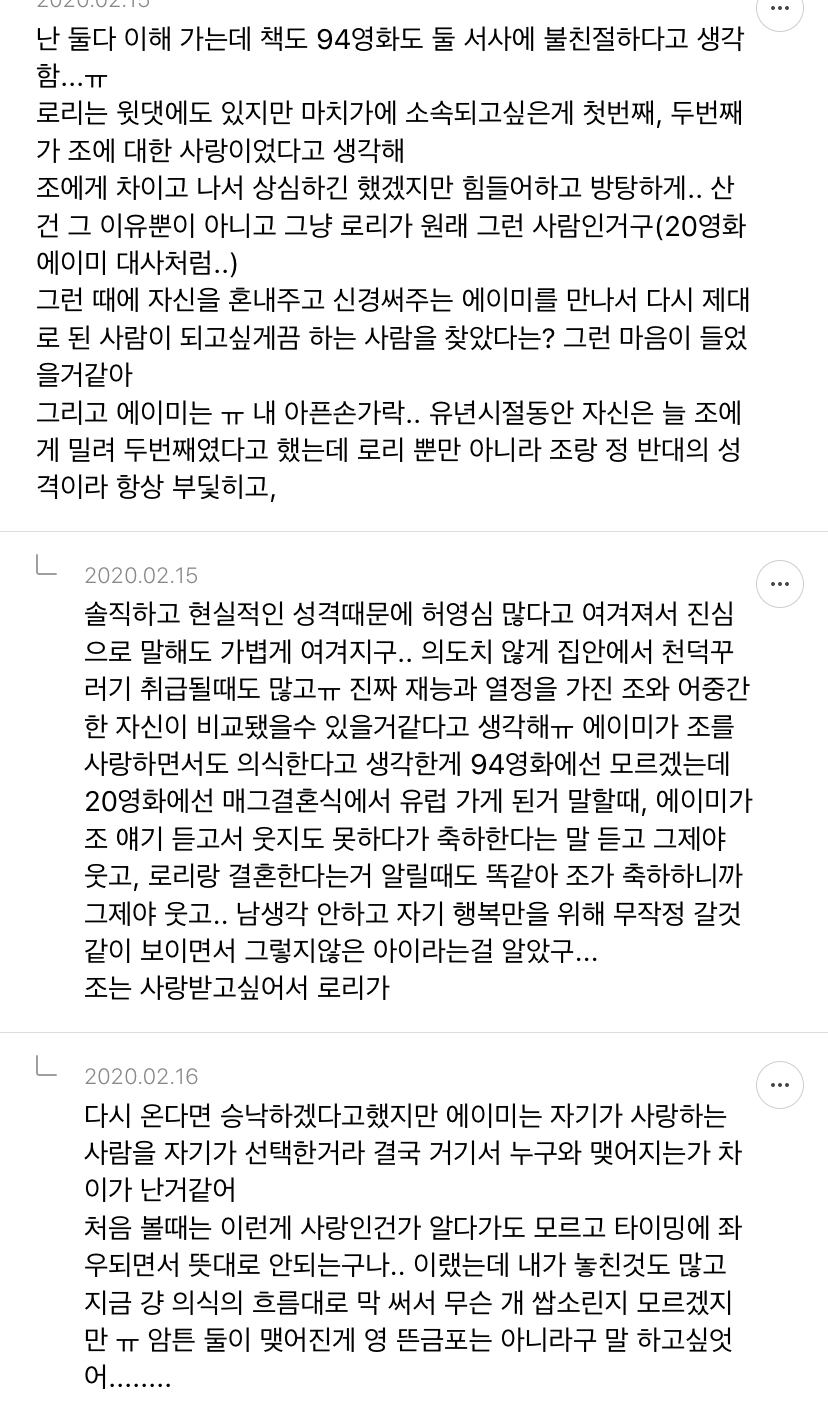 솔직히 로리랑 조가 어울리는 합이 아닌데 에이미랑 로리 된 것도 지나치고 조가 결국 독신주의 꺾은 것도 안 맞아보여서ㅠㅋㅋㅋㅋㅋ -