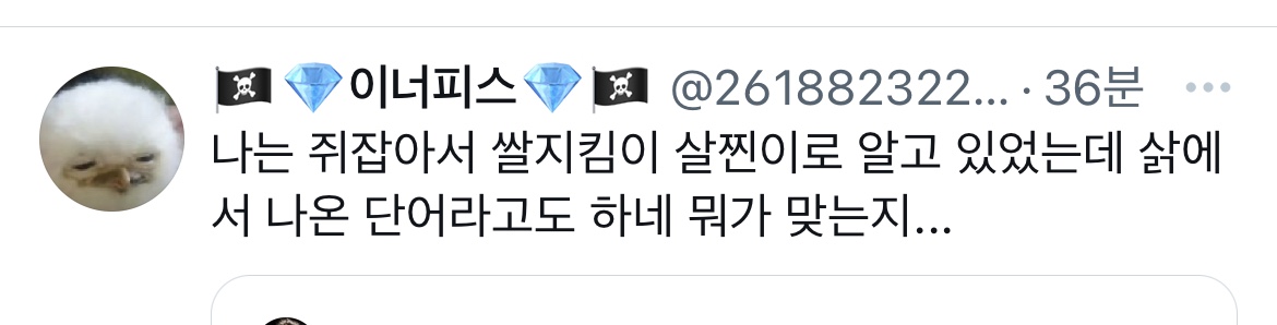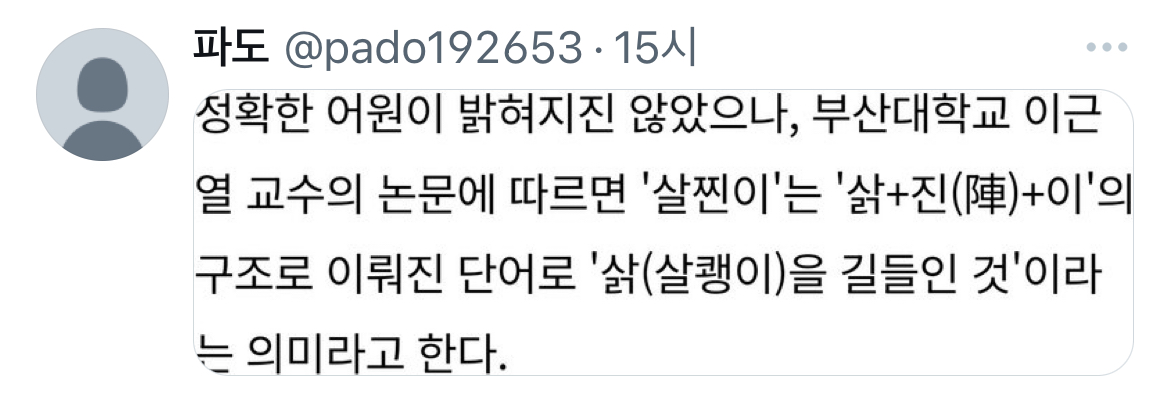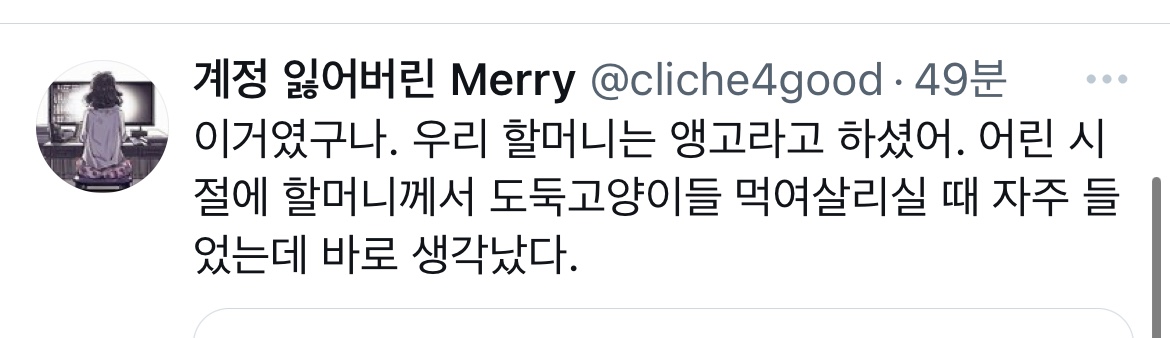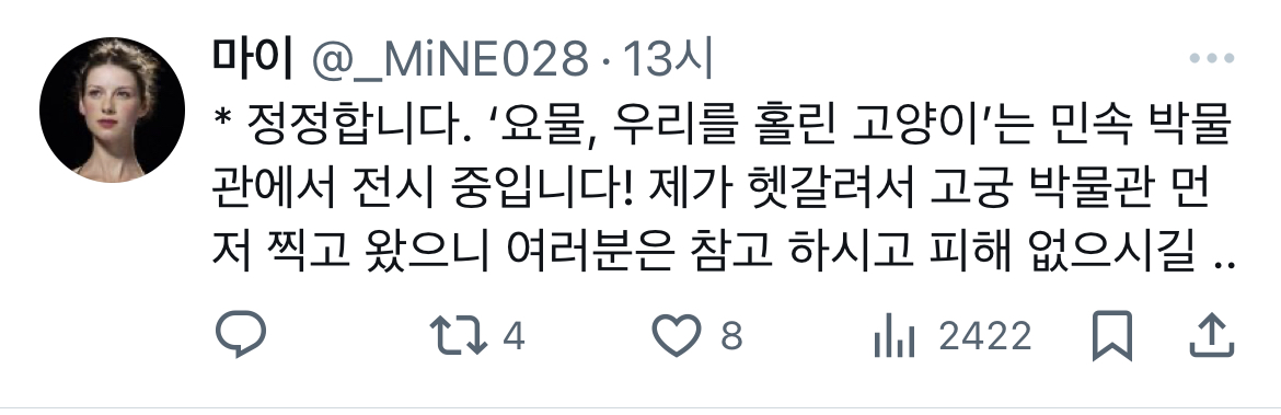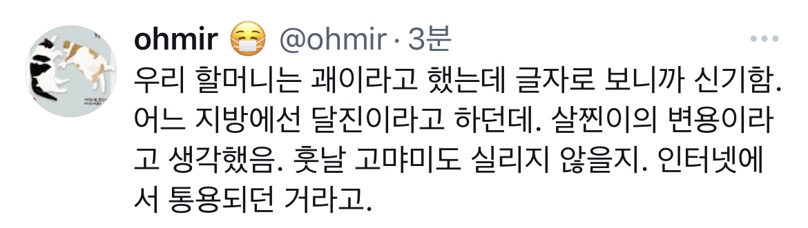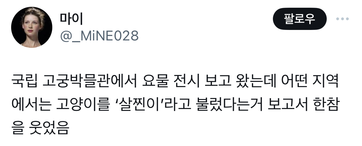 [스크랩] [흥미돋]고양이를 부르는 지역별 방언.twt 작성자이성계|작성시간24.07.05|조회수21,657 목록 댓글 84 글자크기 작게가 글자크기 크게가 출처: 여성시대 낌뚀뚀원출처https://x.com/_mine028/status/1788884490619912257?s=46X의 마이님(@_MiNE028)국립 고궁박믈관에서 요물 전시 보고 왔는데 어떤 지역에서는 고양이를 ‘살찐이’라고 불렀다는거 보고서 한참을 웃었음twitter.com 다음검색 스크랩 원문 : *여성시대* 차분한 20대들의 알흠다운 공간 현재 게시글 추가 기능 열기 북마크 공유하기 신고 센터로 신고 댓글 댓글 84 댓글쓰기 답글쓰기 댓글 리스트 작성자고양이너무사랑해 | 작성시간 24.07.05 괭이~~~ 작성자집드가자 | 작성시간 24.07.05 앵꼬 작성자영냐냐 | 작성시간 24.07.06 괴! 작성자최안나 | 작성시간 24.07.06 괭이 고냥이 작성자소년탐정김전일 | 작성시간 24.07.06 저기요?! 살찐이요?! 댓글 전체보기