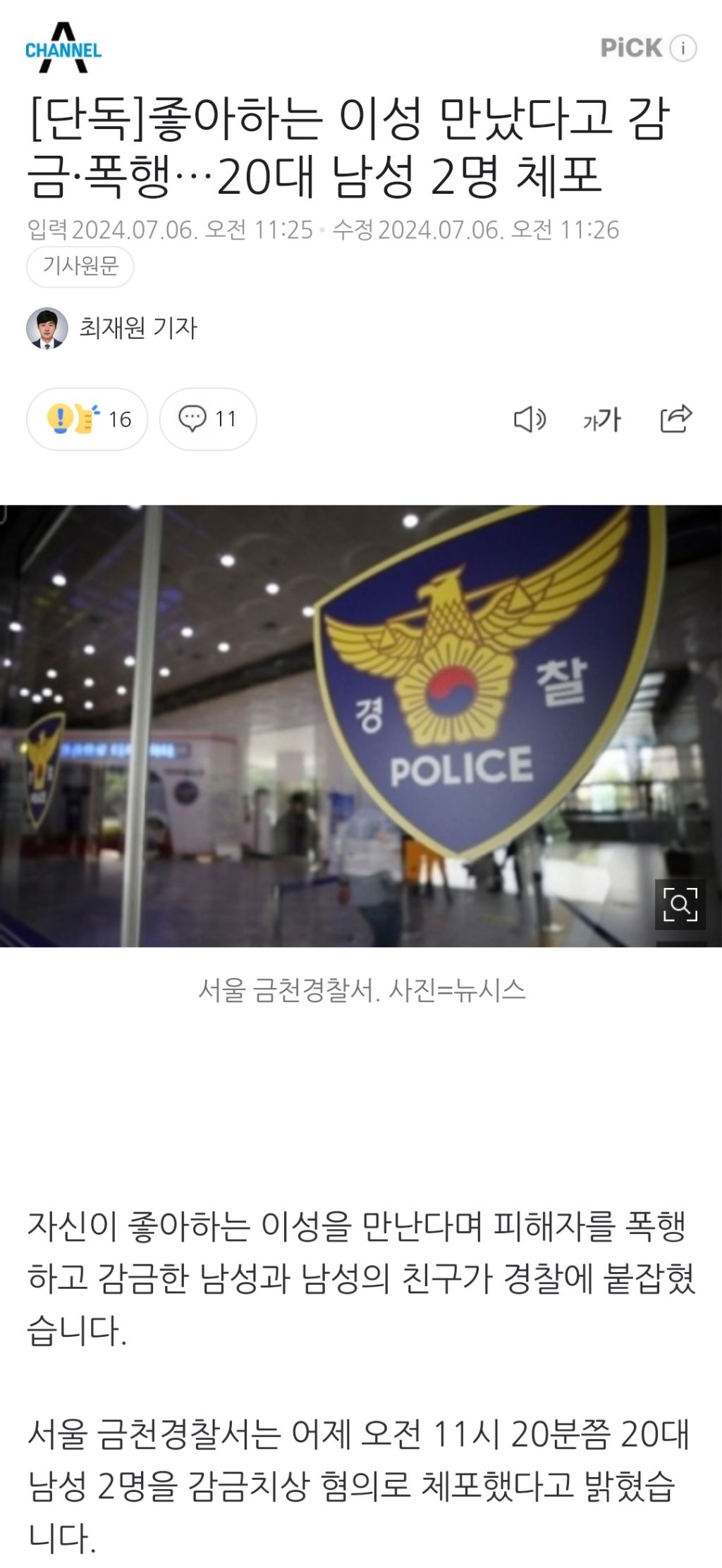 [여시뉴스데스크][단독]좋아하는 이성 만났다고 감금·폭행…20대 남성 2명 체포 작성자천리길|작성시간24.07.06|조회수1,381 목록 댓글 3 글자크기 작게가 글자크기 크게가 출처: https://naver.me/5z5A8Ari[단독]좋아하는 이성 만났다고 감금·폭행…20대 남성 2명 체포자신이 좋아하는 이성을 만난다며 피해자를 폭행하고 감금한 남성과 남성의 친구가 경찰에 붙잡혔습니다. 서울 금천경찰서는 어제 오전 11시 20분쯤 20대 남성 2명을 감금치상 혐의로 체포했다고n.news.naver.com이하 생략전문 출처로🔗관련 기사https://naver.me/FbOW4nhT"내가 좋아하는 여성 왜 만나"…친구 감금·폭행 20대 남성 2명 체포20대 또래 친구를 감금하고 폭행한 20대 남성 2명이 경찰에 붙잡혔습니다. 서울 금천경찰서는 감금치상 혐의로 20대 남성 A 씨 등 2명을 입건해 조사 중이라고 오늘(6일) 밝혔습니다. A 씨 등은 어제n.news.naver.comhttps://naver.me/xmx8StDt‘좋아하는 여성 만났다고’ 친구 감금·폭행한 20대 남성들 체포자신이 좋아하는 여성을 만났다는 이유로 친구를 감금하고 폭행한 20대 남성과 그 친구가 경찰에 붙잡혔습니다. 서울 금천경찰서는 감금치상 등의 혐의로 A 씨 등 20대 남성 2명을 어제(5일) 오전 n.news.naver.com 다음검색 현재 게시글 추가 기능 열기 북마크 공유하기 신고 센터로 신고 댓글 댓글 3 댓글쓰기 답글쓰기 댓글 리스트 작성자바질토마토냉파슽하 | 작성시간 24.07.06 이 나라는....뭔 매일같이... 작성자앱쁠뻬이 | 작성시간 24.07.06 욕나와 ㅅㅂ 작성자망그리도령 | 작성시간 24.07.06 요새 꼬라지 심각하다 댓글 전체보기