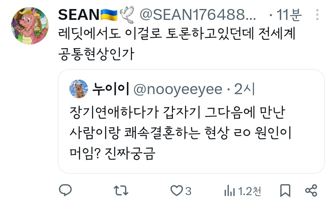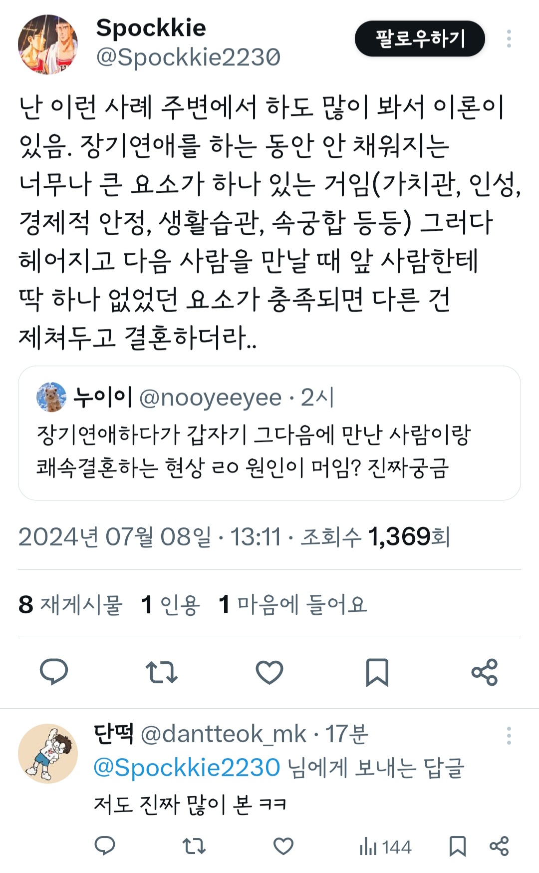 작성자운로새임네닉 작성시간 24.07.10 전남친과의 헤어짐의 원인이 되는 그 부분을 현남친은 갖고있지 않고, 그 외 부분들은 고만고만할 것 같아서 결혼하는거 같음