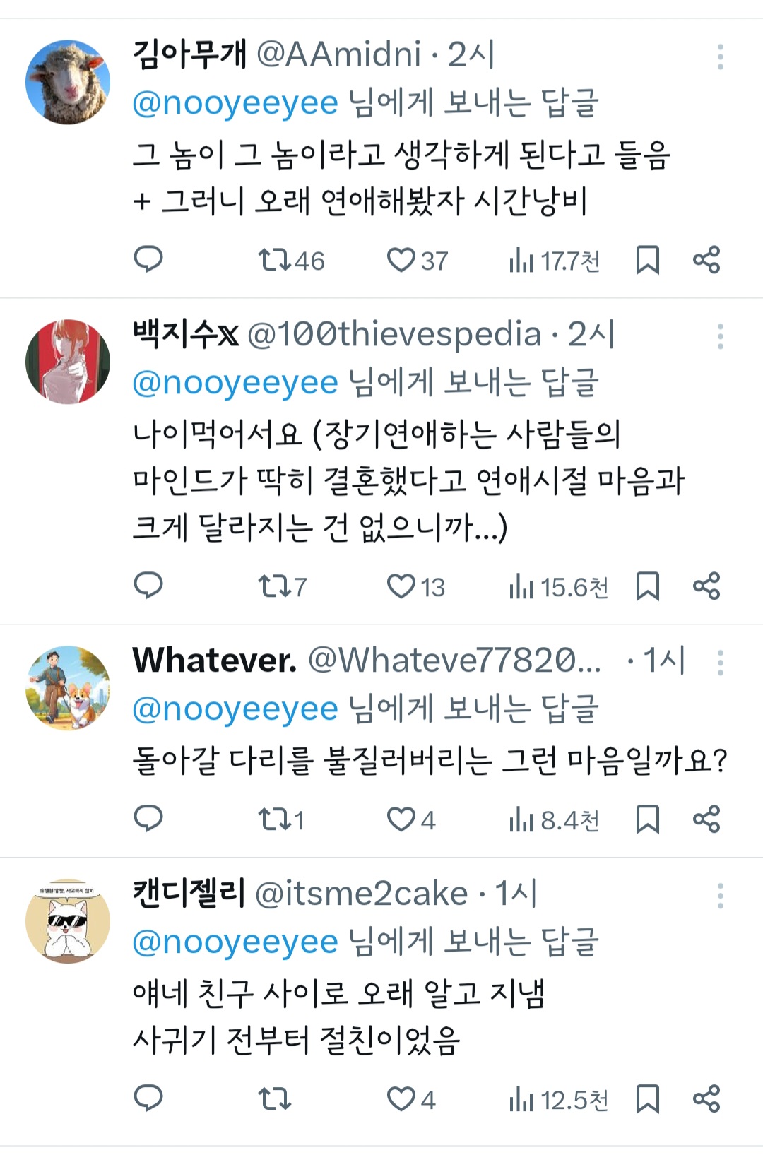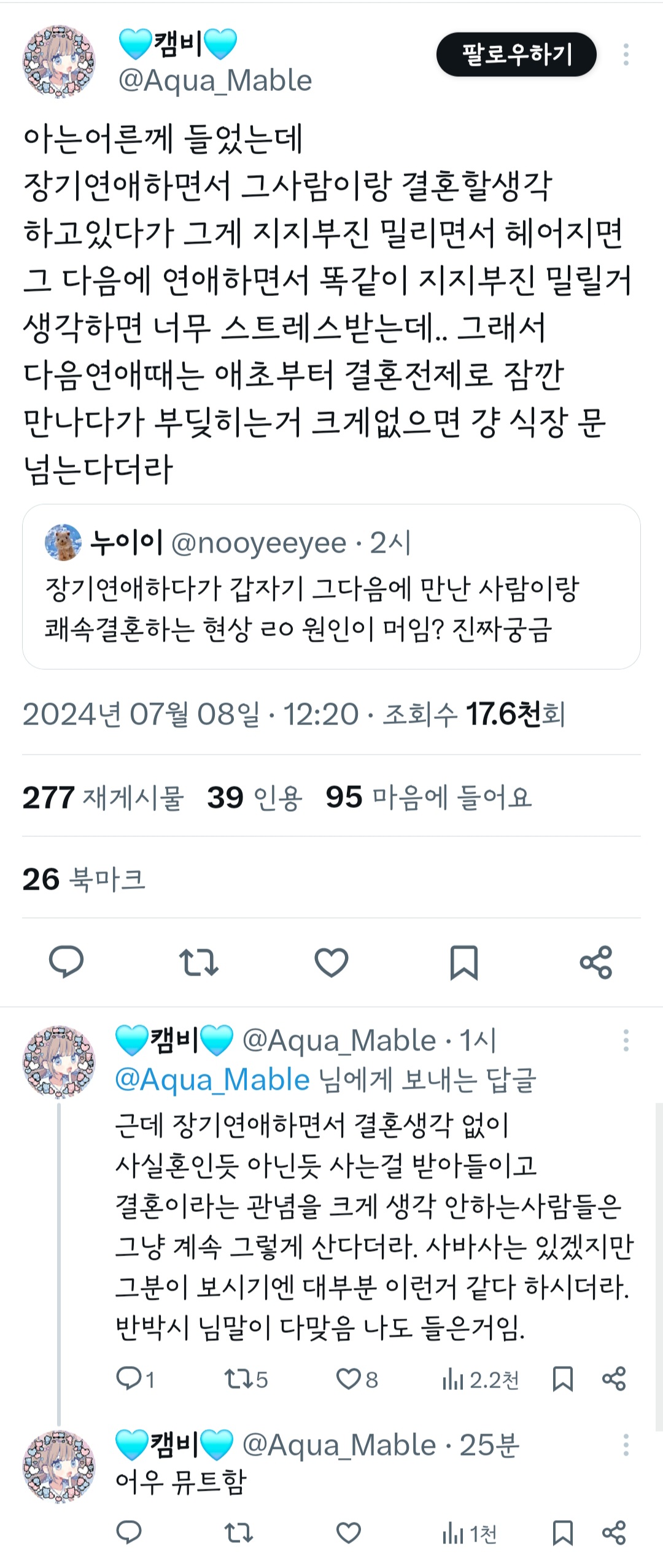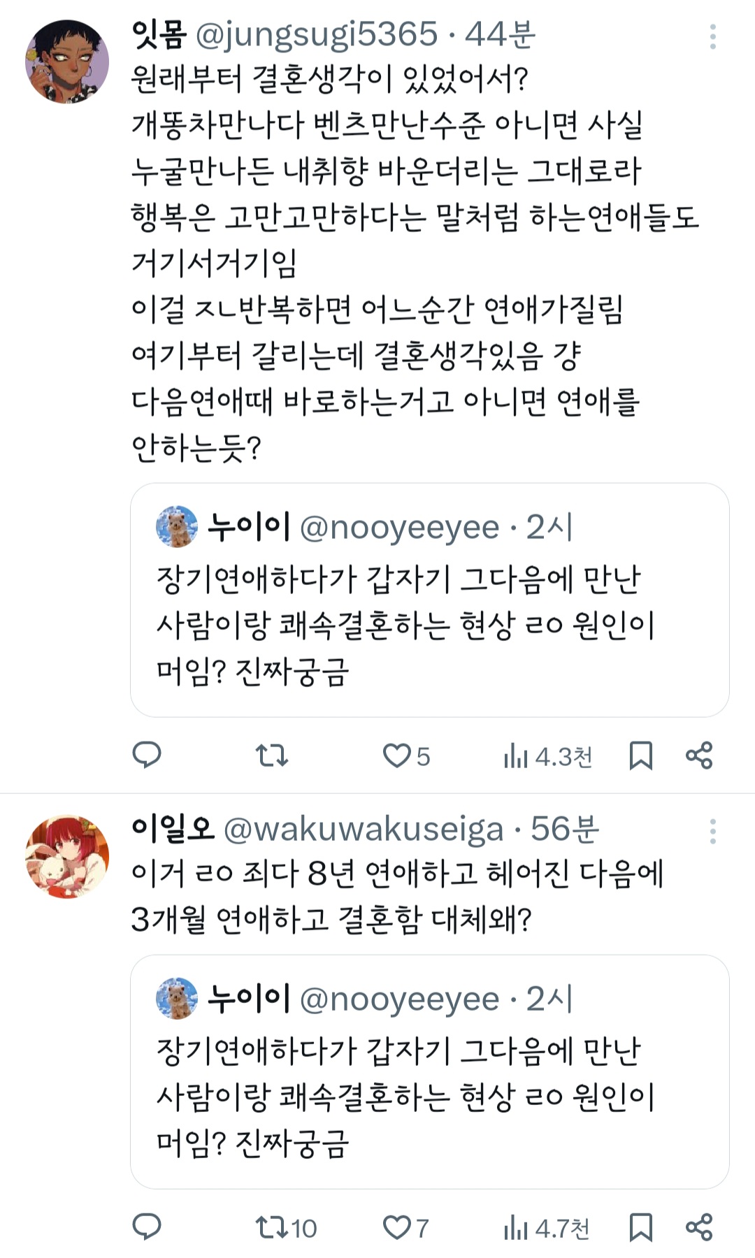 작성자튜브최고 작성시간 24.07.09 오래만나봤자 부질없어서 ㅋㅋㅋㅋㅋ나도 7년만나고 헤어졌어 그렇게 대단한 사랑도 없다는걸 느끼고 나니까 다음연애는 일년정도 만나다가 할거같음 + 나이차서