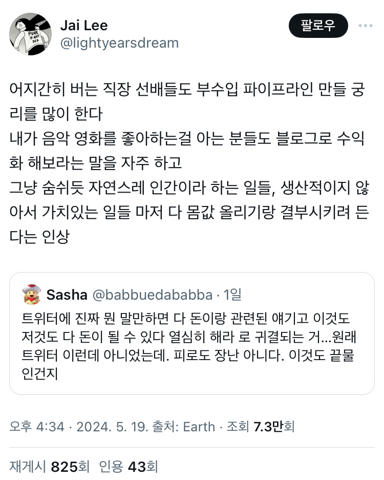 [스크랩] [기타]진짜 뭔 말만하면 다 돈이랑 관련된 얘기고 이것도 저것도 다 돈이 될 수 있다 열심히 해라 로 귀결되는 거…twt