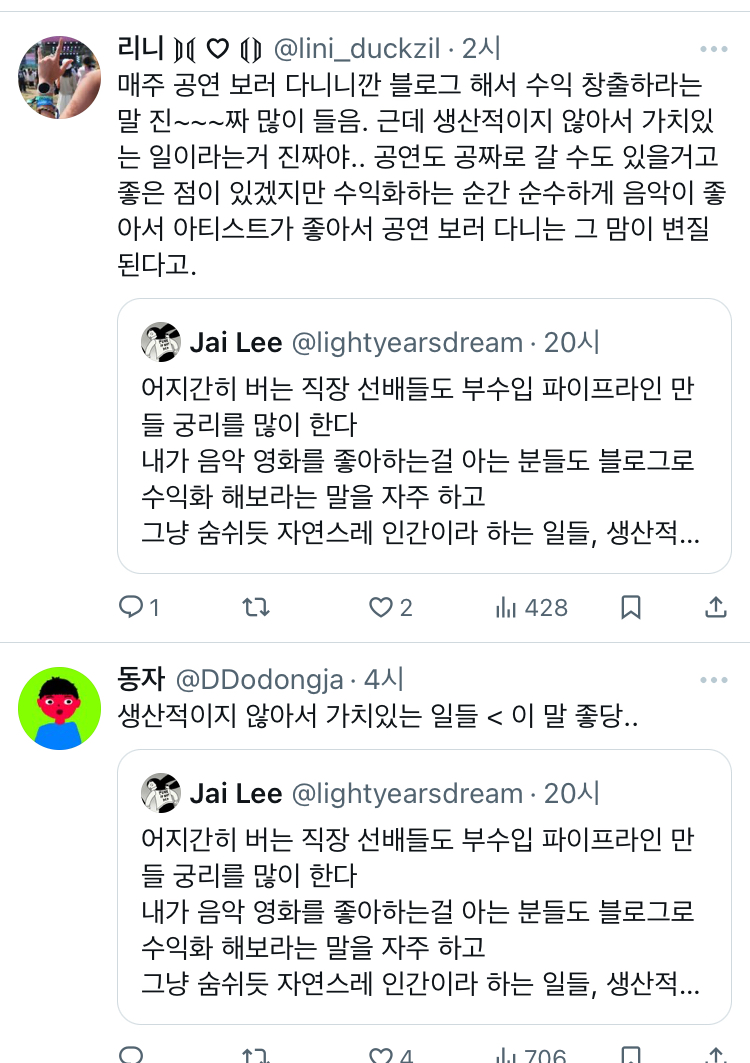 작성자호기긔호긔깅기긔 작성시간 24.07.09 모든걸 돈으로 연결해서 너무 피곤하고 메말라가는거같아 하다못해 취미도 그거 키워서 창업해라~ 이러고...그냥 재미 혹은 내만족을 위한 것들은 가치없는ㄱ게 되버린..