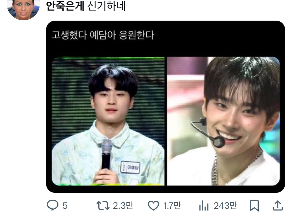 [스크랩] [흥미돋]또다시 알티 타고 있는 화제의 남돌 .... 작성자뿌루루룩룩|작성시간24.07.11|조회수29,649 목록 댓글 172 글자크기 작게가 글자크기 크게가 출처: 여성시대 유우짱역시나 오늘의 주인공 이예담씨..아래의 트윗으로 알티 타며여시에서도 화제였는데.....👇👇👇현재 또 알티 타는 중👇👇👇👇그래서그의 변천사를 나열해보기로 했다태초예담보플예담원팩트예담어케햇노예담안죽은게신기예담이게 되냐.. 다음검색 스크랩 원문 : *여성시대* 차분한 20대들의 알흠다운 공간 현재 게시글 추가 기능 열기 북마크 공유하기 신고 센터로 신고 댓글 댓글 172 댓글쓰기 답글쓰기 댓글 리스트 작성자동방제과 | 작성시간 24.07.12 진짜로 가능... 해 .. ? 턱도 깎은겨 ? 작성자햄주먹밥 | 작성시간 24.07.12 저 청셔츠 입은게 찐... 아이돌계의 교과서 됨 작성자아돈기바워 | 작성시간 24.07.13 어떻게 한 거야..? 작성자벌써바깥은여름 | 작성시간 24.07.13 진짜 제일 신기한 케이스네 작성자도라방스리라차력쇼 | 작성시간 24.07.13 인간적으로 턱 뭐 한건지 좀 알려줘라.. 너무 궁금해 댓글 전체보기