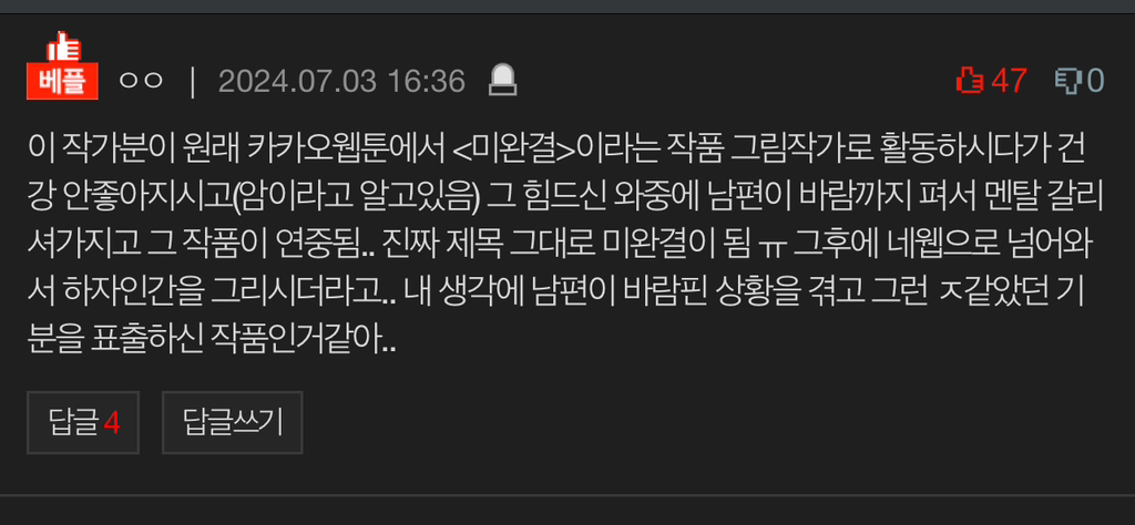 작성자존조 john cho 작성시간 24.07.13 창작작품은 작가의 심리상태에 따라 달라지기땜에 미완작품은 걍 해소될때까지 기다리는게 더 나을수도