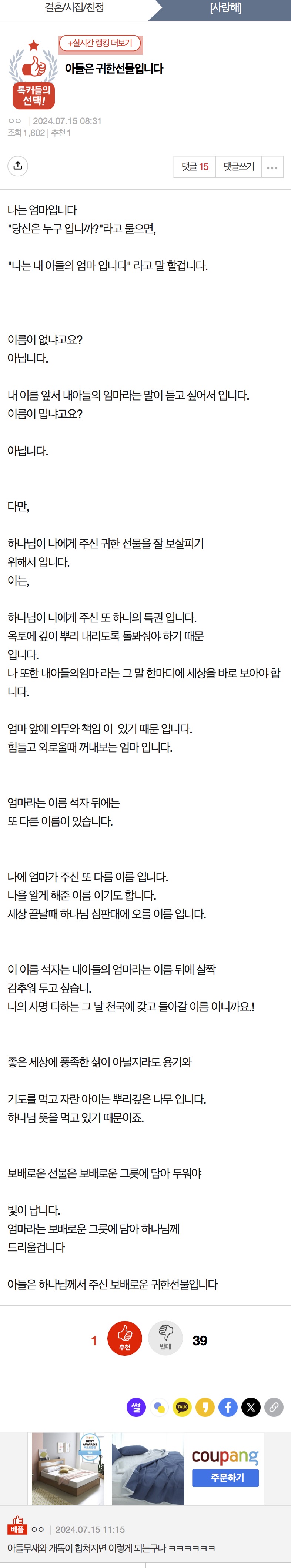 [흥미돋]아들은 귀한선물입니다 작성자꽃아래별|작성시간24.07.15|조회수18,394 목록 댓글 136 글자크기 작게가 글자크기 크게가 출처: https://m.pann.nate.com/talk/372852864?currMenu=talker&order=RAN&rankingType=life&page=2아들은 귀한선물입니다 | 네이트 판결혼/시집/친정 - 사랑해 : 나는 엄마입니다 "당신은 누구 입니까?"라고 물으면, "나는 내 아들의 엄마 입니다" 라고 말 할겁니다. 이름이 없냐고요? 아닙니다. 내 이름 앞서 내아들의 엄...pann.nate.com 다음검색 현재 게시글 추가 기능 열기 북마크 공유하기 신고 센터로 신고 댓글 댓글 136 댓글쓰기 답글쓰기 댓글 리스트 작성자나도행복해져도돼지 | 작성시간 24.07.16 웩 작성자에베레레루 | 작성시간 24.07.16 네네 다음~ 작성자어쩌라고요다야이야이야요 | 작성시간 24.07.16 염병 ㅠ ㅋㅋㅋㅋㅋㅋㅋ 작성자Chloe | 작성시간 24.07.18 뭘 어쩌라고요? 작성자배달의민족쥬무 | 작성시간 24.07.19 상종하기 싫은 스타일 댓글 전체보기