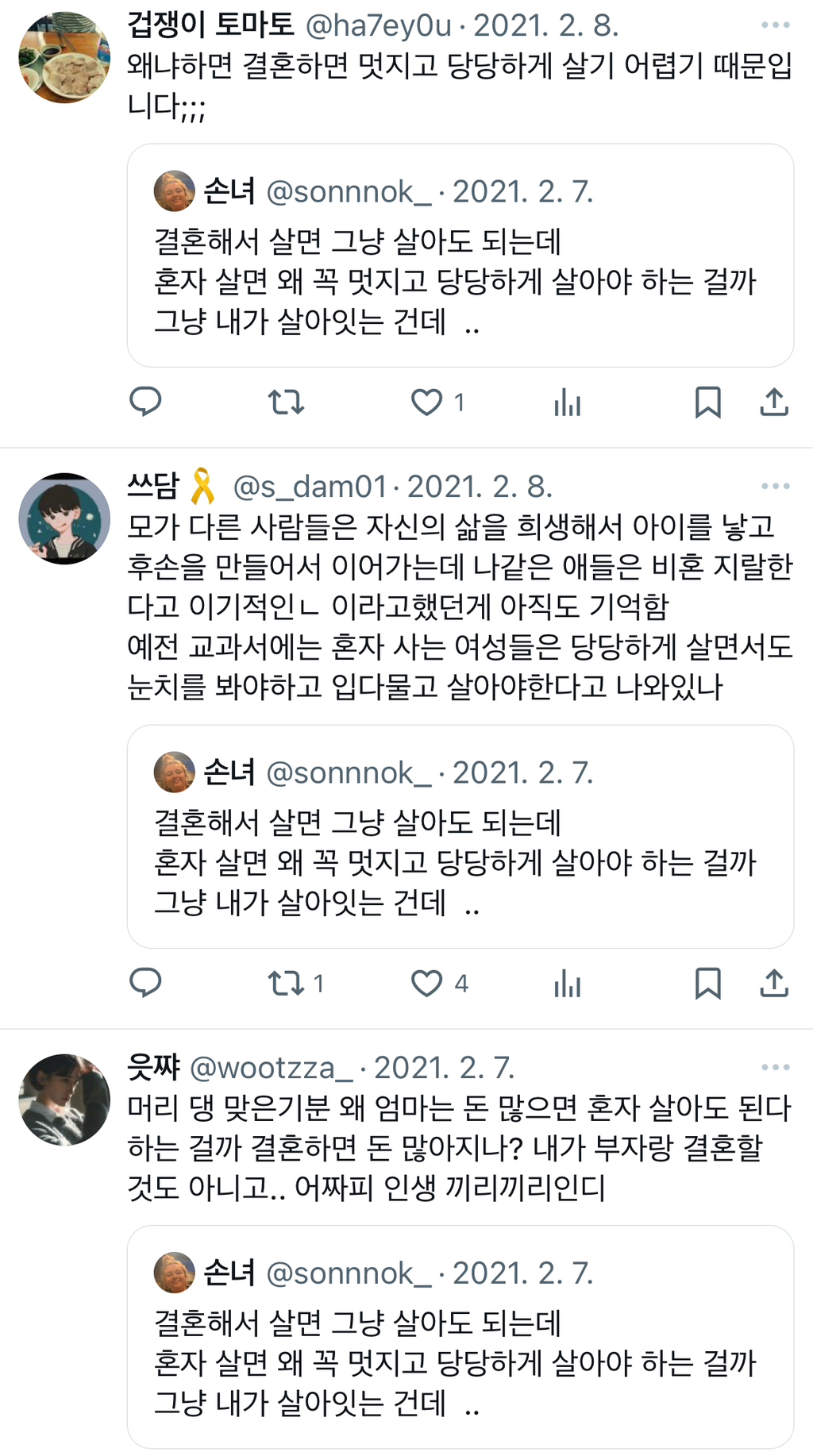 [스크랩] [기타]결혼해서 살면 그냥 살아도 되는데 혼자 살면 왜 꼭 멋지고 당당하게 살아야 하는 걸까 그냥 내가 살아잇는 건데 ..twt