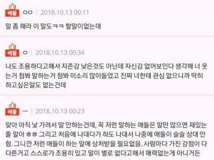 작성자헬스가기귀찮 작성시간 24.07.15 저 말 하기 전에 본인이 타인을 불편하게 하는건 아닌지 함 생각해봤으면... 왜냐면 나도 말없다는 소리 꽤 들었었는데 그 말 한 사람들 앞에서만 말이 없었거든 ㅎ