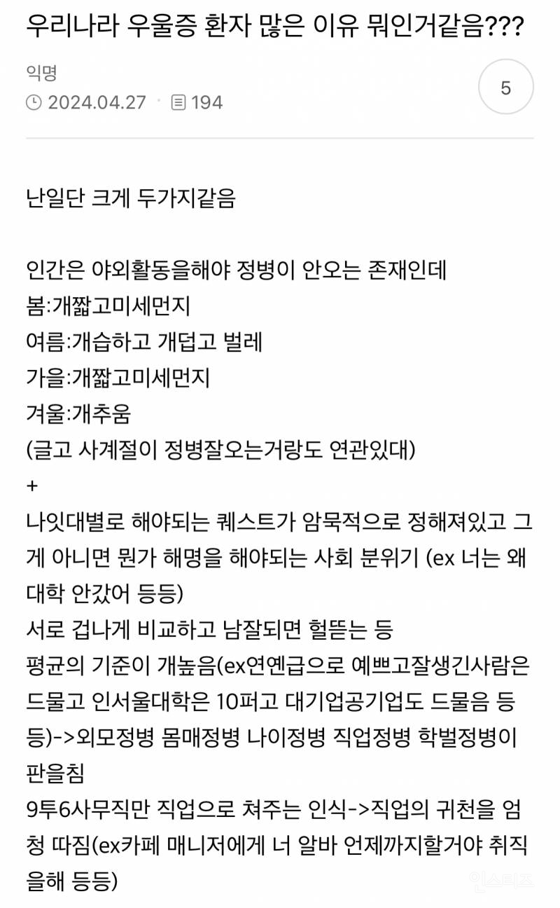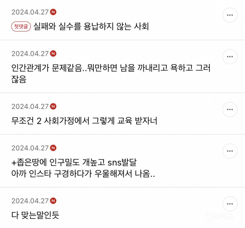 작성자유정부인 작성시간 24.07.16 땅이 좁은데 서울 공화국이라 인구밀도 높아서 .. 이게 젤 큼 .. 그래서 경쟁문화도 심해지고