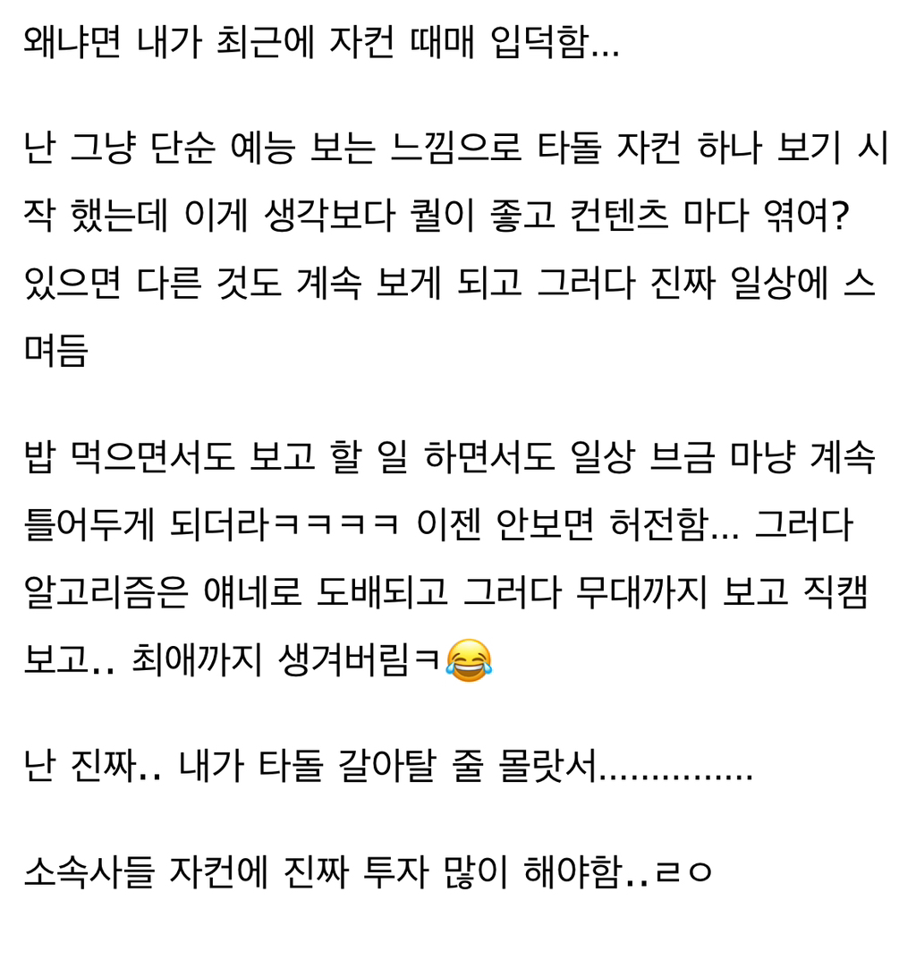 작성자KaiSa 작성시간 24.07.17 머글겨냥은 아니고 돌팬겨냥인듯 자컨이라는 단어도 처음알았네