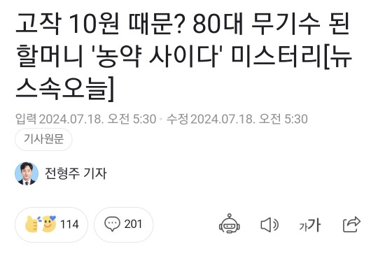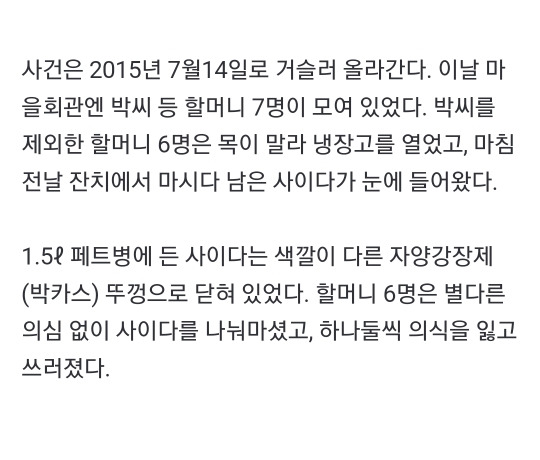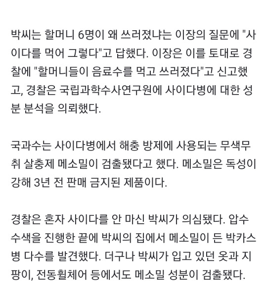 [여시뉴스데스크]고작 10원 때문? 80대 무기수 된 할머니 '농약 사이다' 미스터리 작성자덕수사랑|작성시간24.07.19|조회수4,183 목록 댓글 8 글자크기 작게가 글자크기 크게가 출처: 여성시대 덕수사랑https://naver.me/xFLjos4t...... 다음검색 현재 게시글 추가 기능 열기 북마크 공유하기 신고 센터로 신고 댓글 댓글 8 댓글쓰기 답글쓰기 댓글 리스트 작성자검독수리 | 작성시간 24.07.19 이 사건 유명했지. 은근 비슷한 사건 많더라. 보은 콩나물밥 살충제 사건은 아직도 미제야. 그것도 마을사람중에 범인이 있을텐데. 작성자Smart people | 작성시간 24.07.19 왜그랬을까;; 작성자물딱복숭아 | 작성시간 24.07.19 미친 겨우 10원짜리 화투때문에 작성자의지와표상으로서의세계 | 작성시간 24.07.19 평소에도 원한이 있었나.. 작성자cosmic love | 작성시간 24.07.19 ㅉㅉ 미친 할매 댓글 전체보기