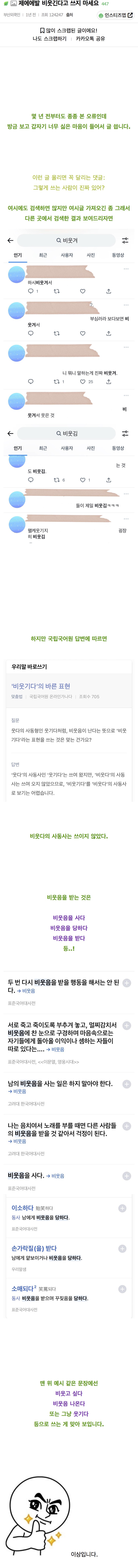 [스크랩] [흥미돋]제에에발 비웃긴다고 쓰지 마세요.jpg 작성자셉템버|작성시간24.07.19|조회수24,803 목록 댓글 325 글자크기 작게가 글자크기 크게가 출처: 여성시대 (본인 닉네임)ㄱ출처 ㄷㅋ 어느샌가부터 많이 보이는 비웃겨, 비웃김 밈으로 쓰는건지 진짜 그렇게 알고 쓰는건지 궁금함 다음검색 스크랩 원문 : *여성시대* 차분한 20대들의 알흠다운 공간 현재 게시글 추가 기능 열기 북마크 공유하기 신고 센터로 신고 댓글 댓글 325 댓글쓰기 답글쓰기 댓글 리스트 작성자돈쓰는거 | 작성시간 24.07.20 얼마전에 웹소설보다 봤는데 …. 정뚝떨 작성자new yorker | 작성시간 24.07.20 걍 맞춤법을 창조하네... 저게 뭐여 작성자냥냥냐옹쓰 | 작성시간 24.07.20 비웃기는게 뭔말이여 대박.. 작성자검은조직 | 작성시간 24.07.20 저런 단어를 지금 첨 들어봄ㅋㅋㅋㅋ 작성자sahoiin게임클럽 | 작성시간 25.12.03 진짜 등신 같은 어휘닼ㅋㅋㅋ 멍청해보여... 댓글 전체보기