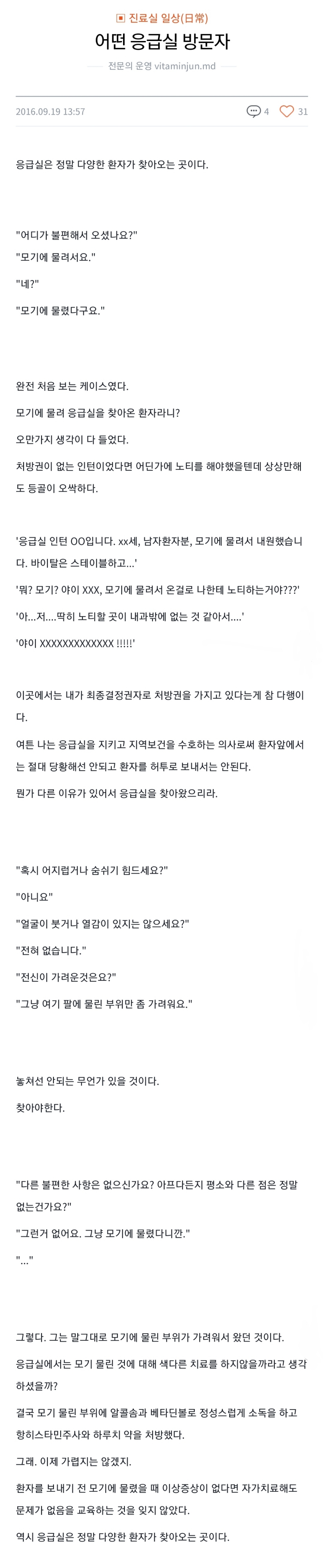 [스크랩] [흥미돋]남자환자분 모기에 물려서 응급실 내원했습니다 작성자노 아|작성시간24.07.19|조회수15,426 목록 댓글 73 글자크기 작게가 글자크기 크게가 출처 : 여성시대 머쓱타드https://vitaminjun.tistory.com/m/72 다음검색 스크랩 원문 : *여성시대* 차분한 20대들의 알흠다운 공간 현재 게시글 추가 기능 열기 북마크 공유하기 신고 센터로 신고 댓글 댓글 73 댓글쓰기 답글쓰기 댓글 리스트 작성자인아웃 | 작성시간 24.07.19 저런 사람들 보면 같은 의무교육 받은 사람일텐데 왜 저러지 싶어;; 작성자만두니가몬데 | 작성시간 24.07.19 정신과로 가셔야 하는거 아닌가.. 삭제된 댓글입니다. 답댓글 작성자탈병원탈임상 | 작성시간 24.07.19 ㄹㅇㅋㅋㅋㅋ 작성자돈벼락좀맞아보자 | 작성시간 24.07.19 .... 댓글 전체보기
