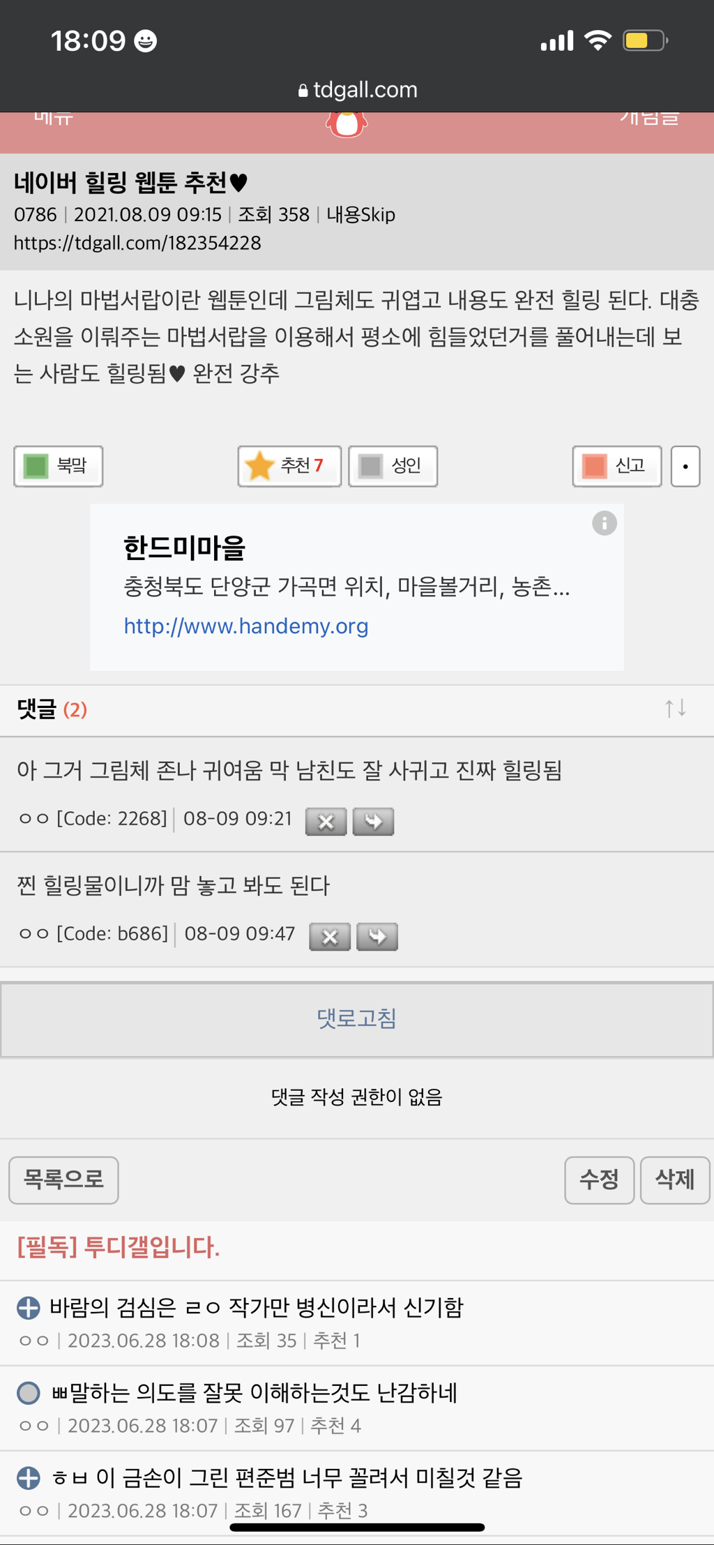 [스크랩] [흥미돋]사람들이 많이 추천하는 힐링물 웹툰 작성자지평평자표계|작성시간24.07.19|조회수3,820 목록 댓글 11 글자크기 작게가 글자크기 크게가 출처 : 여성시대 취소하시겠습니까 다음검색 스크랩 원문 : *여성시대* 차분한 20대들의 알흠다운 공간 현재 게시글 추가 기능 열기 북마크 공유하기 신고 센터로 신고 댓글 댓글 11 댓글쓰기 답글쓰기 댓글 리스트 작성자모노로로호 | 작성시간 24.07.19 유료전환됐네 ㅠㅡㅠ 아쉽 작성자복많은부자 | 작성시간 24.07.19 ㅋㅋㅋㅋㅋ힐링물이라닠ㅋㅋㅋㅋㅋㅋㅋ 작성자너는너운명721 | 작성시간 24.07.19 오 나.요즘힘들었는데 추천고마육 답댓글 작성자너는너운명721 | 작성시간 24.07.19 헐 30화까지봄 작성자스킹로숑 | 작성시간 24.07.19 이거 존잼 ㅠㅠ 댓글 전체보기