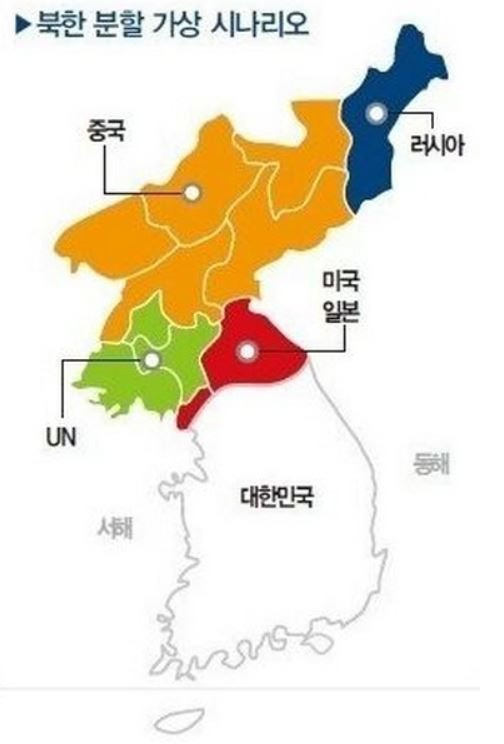 2015년 원전반대그룹이 한국 정부 기관을 해킹하여 공개된 중국이 미국에 제안한 4분할 통치 체제 시나리오. 북한 급변사태 시 중국이 주장하는 전쟁 없는 '평화적 해결' 방안