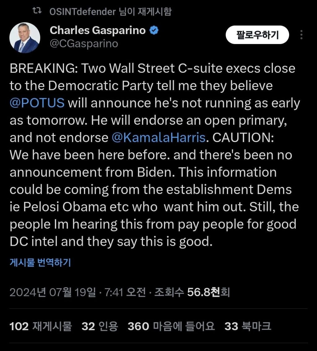 [여시뉴스데스크]속보) 바이든 내일 대통령 후보 사퇴 발표 작성자사리유스|작성시간24.07.19|조회수33,992 목록 댓글 172 글자크기 작게가 글자크기 크게가 출처: 여성시대 사리유스폭스뉴스더힐지금 진행 중인 공화당 전대가 끝나는대로 중요한 거취 발표를 진행하고 해리스를 밀 것이라는 보도도박사이트에선 벌써 바이든 이름 내림후보 사퇴 벌써 반영된듯바이든 날리면이 현실이 되어벌임 다음검색 현재 게시글 추가 기능 열기 북마크 공유하기 신고 센터로 신고 댓글 댓글 172 댓글쓰기 답글쓰기 댓글 리스트 작성자HUNTERxHUNTER | 작성시간 24.07.19 헐 사퇴 작성자planetarium | 작성시간 24.07.19 와 작성자sweet like bubble | 작성시간 24.07.20 와 작성자중요한 건 깍 끼지 않는 마음 | 작성시간 24.07.20 와... 작성자Surrender, or go extinct | 작성시간 24.07.21 워 댓글 전체보기
