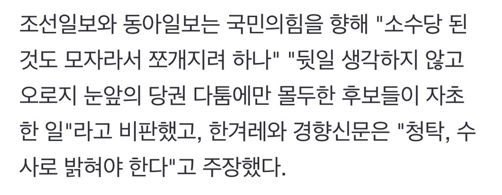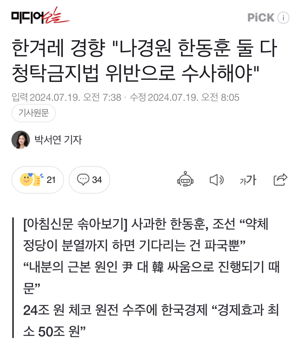 [여시뉴스데스크]한겨레 경향 "나경원 한동훈 둘 다 청탁금지법 위반으로 수사해야" 작성자소리앙|작성시간24.07.19|조회수598 목록 댓글 1 글자크기 작게가 글자크기 크게가 출처: https://naver.me/Gj6S6VIC한겨레 경향 "나경원 한동훈 둘 다 청탁금지법 위반으로 수사해야"한동훈 국민의힘 당 대표 후보가 당대표 선거가 시작된 후 상대 후보에게 처음으로 사과했다. 한동훈 후보는 18일 SNS에 자신의 '나경원 공소 취소 청탁' 발언과 관련해 "신중하지 못했던 점 죄송n.news.naver.com전문출처 다음검색 현재 게시글 추가 기능 열기 북마크 공유하기 신고 센터로 신고 댓글 댓글 1 댓글쓰기 답글쓰기 댓글 리스트 작성자꾀꼬리마이클 | 작성시간 24.07.22 범죄 저지르려고 법 공부한 대표주자 댓글 전체보기