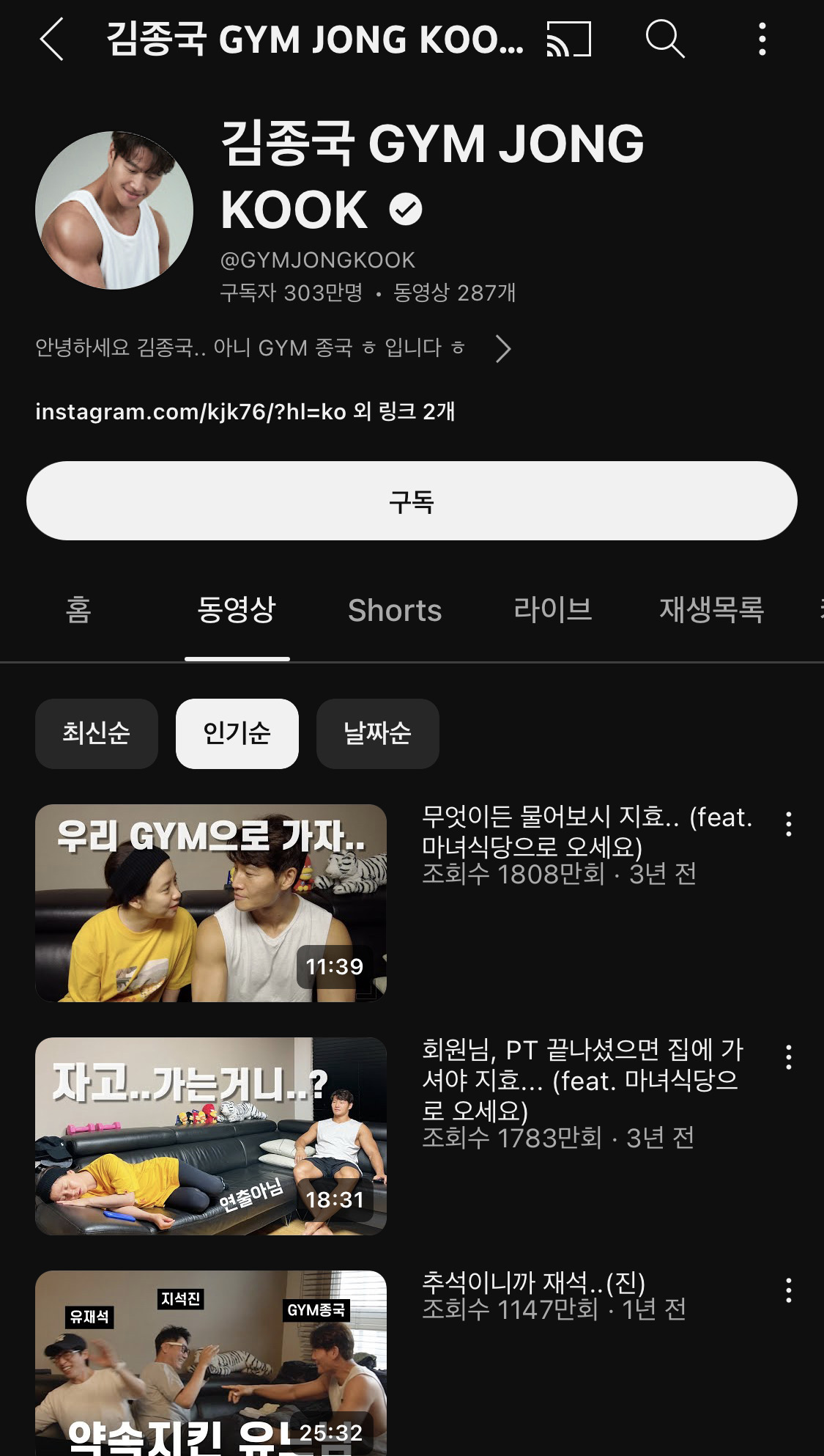 허리아팠던 때 이후로 시작한 운동으로 한우물파더니 급기야 유튜버까지 됐는데 벌써 300만에 최고조회수는 1800만이 넘음...