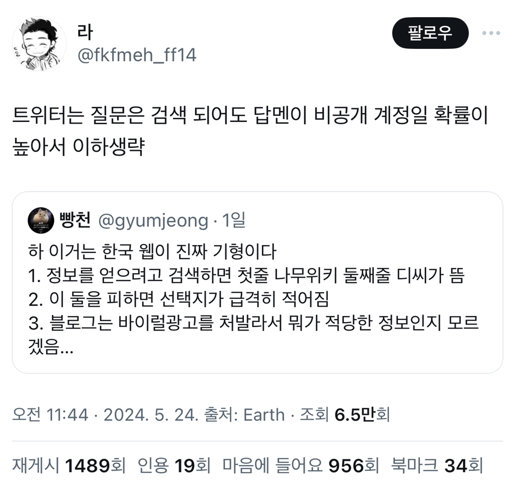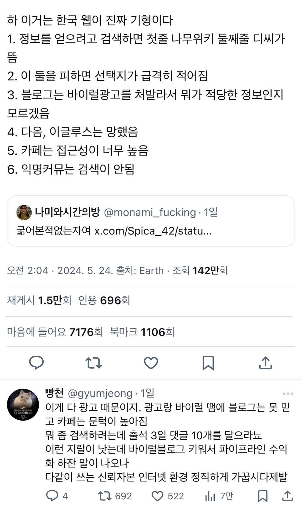 [스크랩] [흥미돋]트위터에서 알티탄 우리나라 사람들 서치할때 특 작성자준휴|작성시간24.07.20|조회수8,227 목록 댓글 11 글자크기 작게가 글자크기 크게가 출처: 여성시대 크뽕이 다음검색 스크랩 원문 : *여성시대* 차분한 20대들의 알흠다운 공간 현재 게시글 추가 기능 열기 북마크 공유하기 신고 센터로 신고 댓글 댓글 11 댓글쓰기 답글쓰기 댓글 리스트 작성자DIAMONDS | 작성시간 24.07.20 ㄹㅇ 작성자팜삐린 | 작성시간 24.07.20 나무위키 위키트리 두개가 상위에 뜨던데 개짜증나 작성자마디 | 작성시간 24.07.20 구글링함 작성자새해에는부지런해지기 | 작성시간 24.07.20 그래서 대부분 구글에서 영어로 검색함.. 작성자세계일류상품 | 작성시간 24.07.20 블로그 ㄹㅇ 광고많 댓글 전체보기