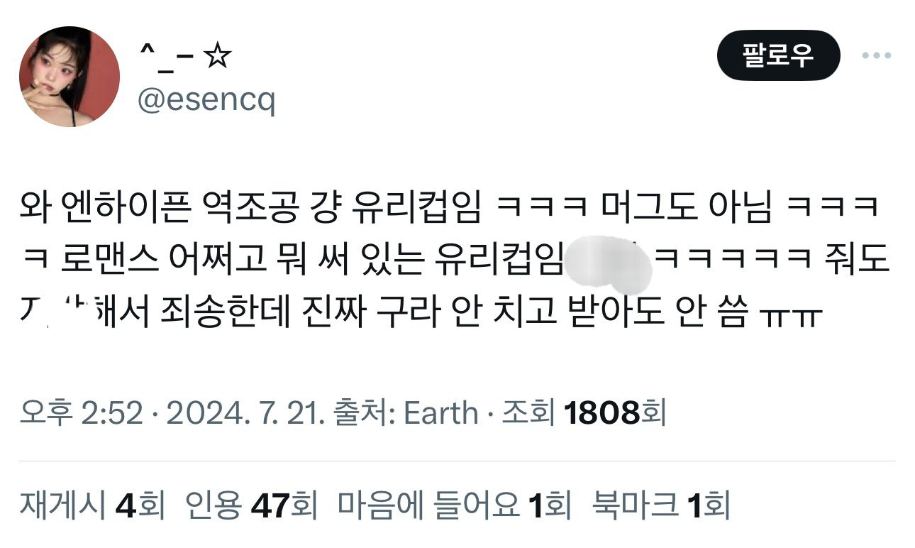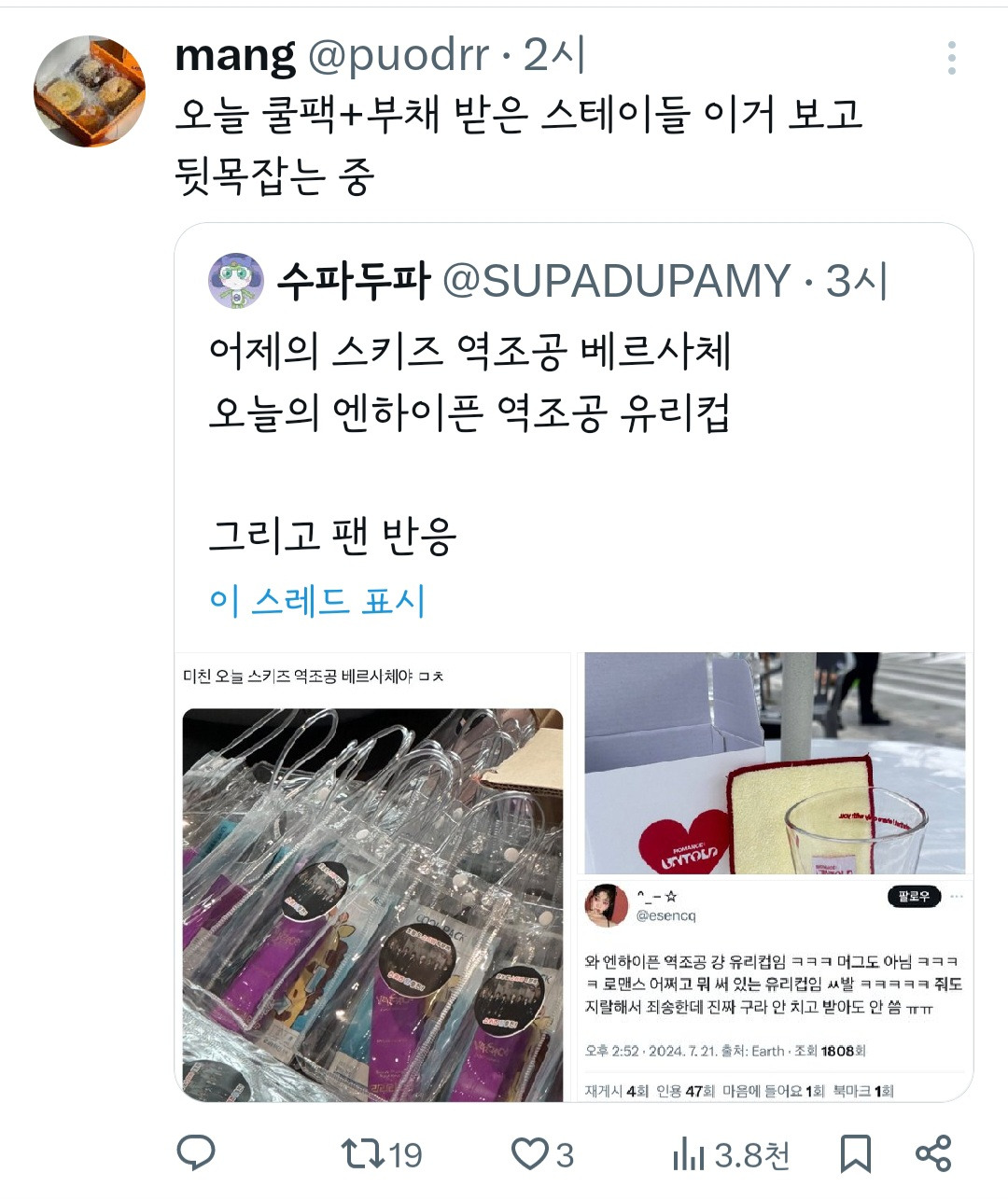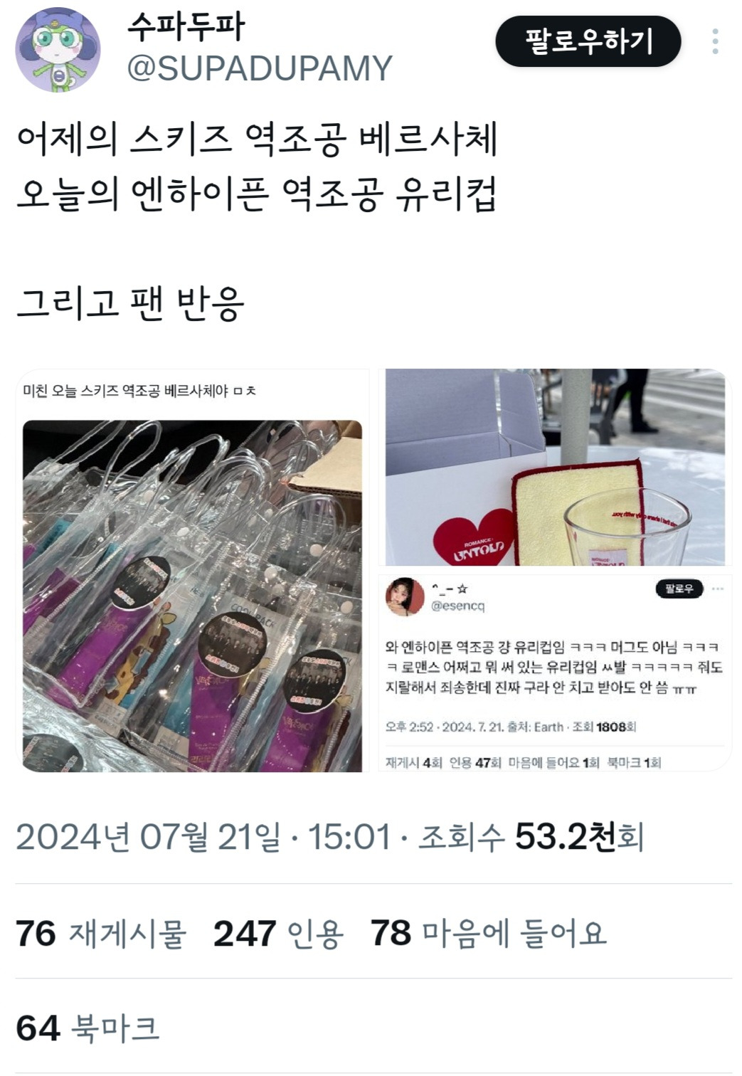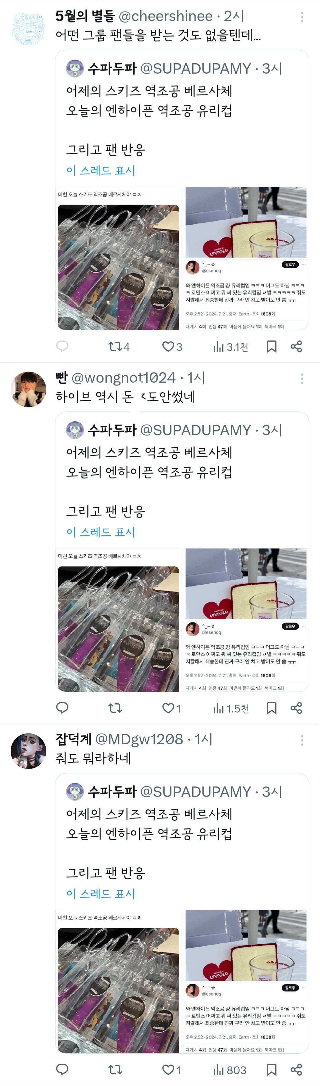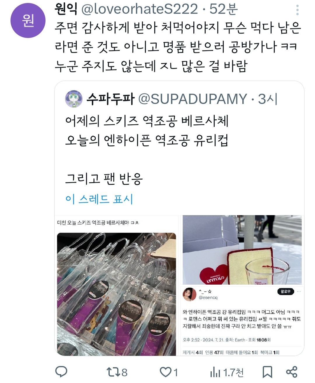 작성자쾁풍콱콸라 작성시간 24.07.22 뉴진스가 그냥 잘 주는 거긴 함...그리고 잘은 모르지만 찾아보니까 엔하이픈은 저 돗자리 줬다니까 멤버들도 네?? 겨우 그거 줬다고요? 이 반응이던데 회사마다 다를 수도 있지만 팬매가? 알아서 다 하는 듯...