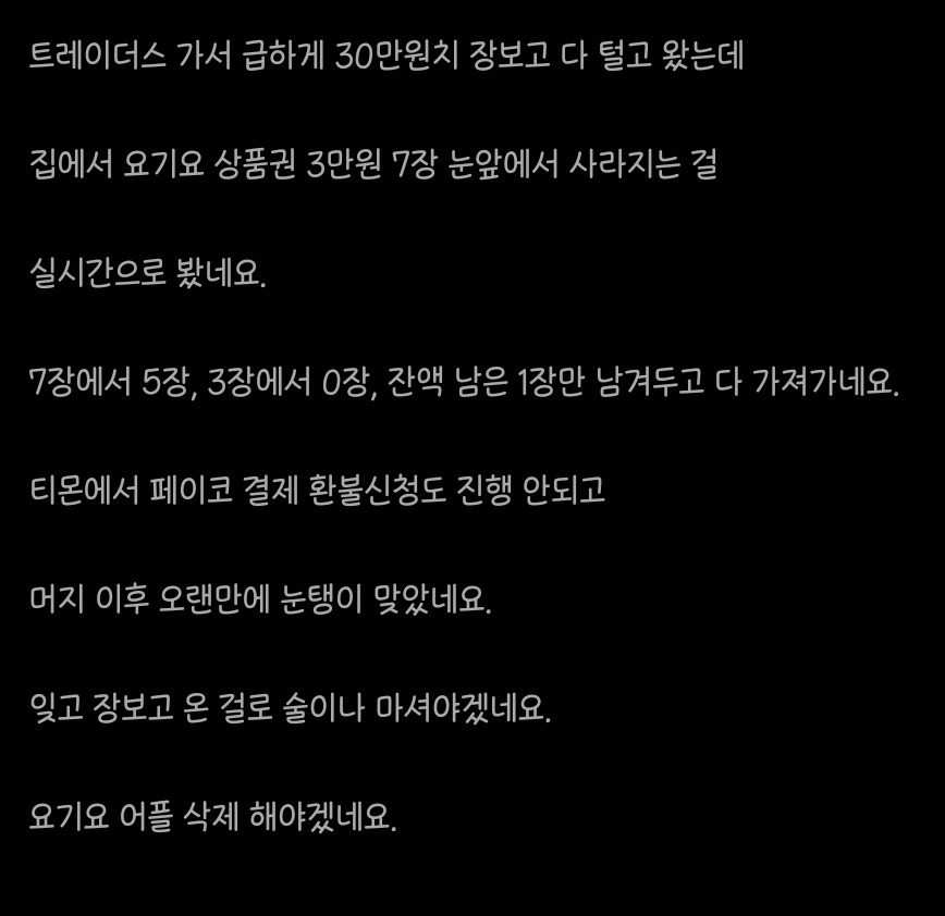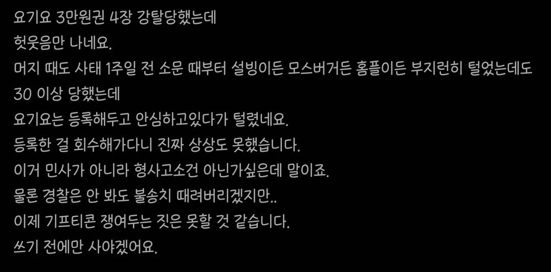 작성자copper 작성시간 24.07.26 가끔 오픈마켓에서 상품권 뜨면 사놓고 등록만 해둔 담에 까먹고 그랬었는데 이거 걍 판매자가 몰래 취소시키면 난 평생 모르는 시스템이네 ㅋㅋㅋ 요기요 절대 안써먹을거임