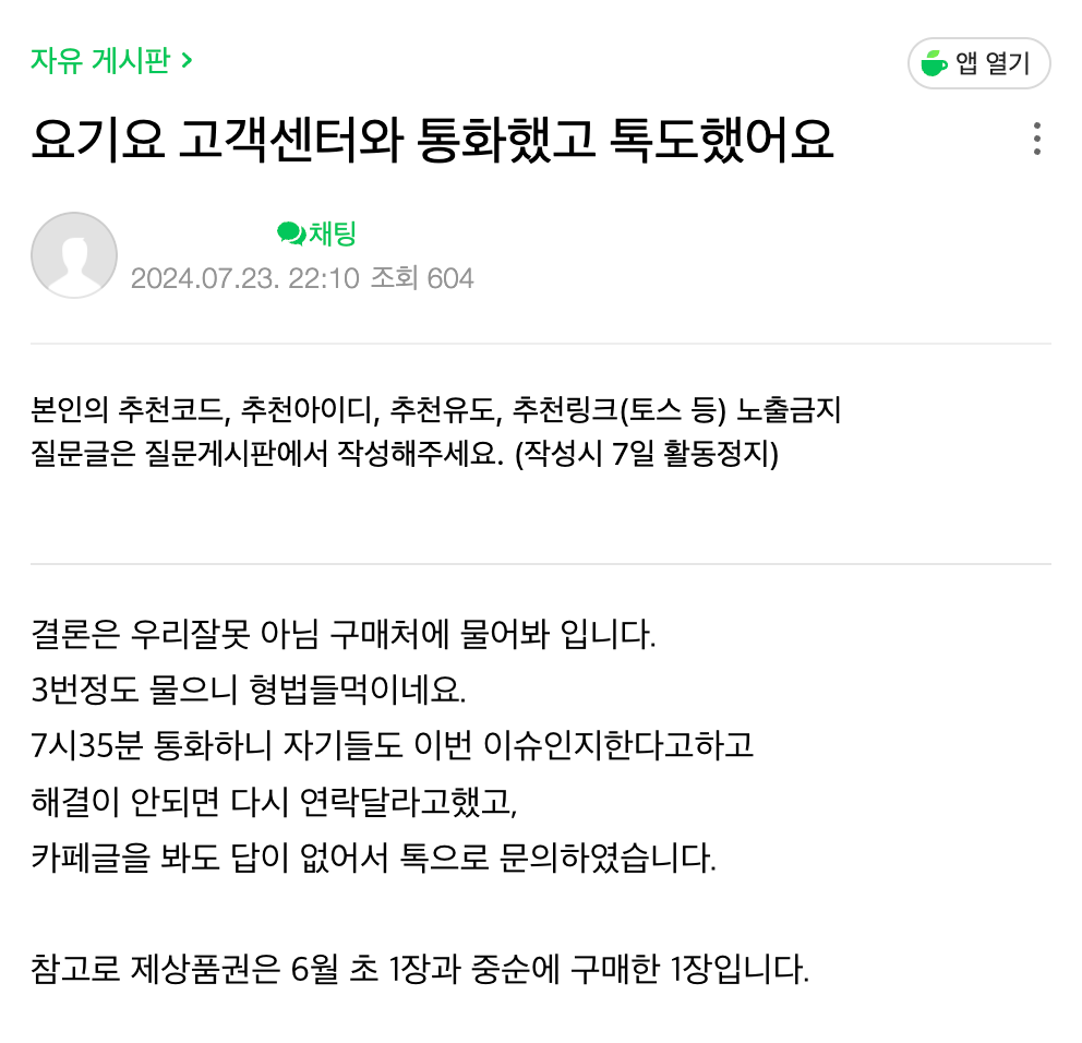 상품권 떼인 구매자가 복구해달라고 요기요는 책임 없냐고 따지니깐