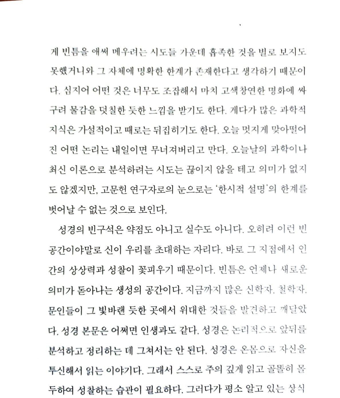 이 책 앞 내용을 보면 "사람들은 이런 빈구석을 애써 채우려고 시도한다. 이런저런 철학적 개념을 통해서, 때로는 과학적 지식을 동원하여 설명하기도 한다. 그런 시도들이 의미가 없지는 않지만 별로 달갑지는 않다"라고 적혀있음.