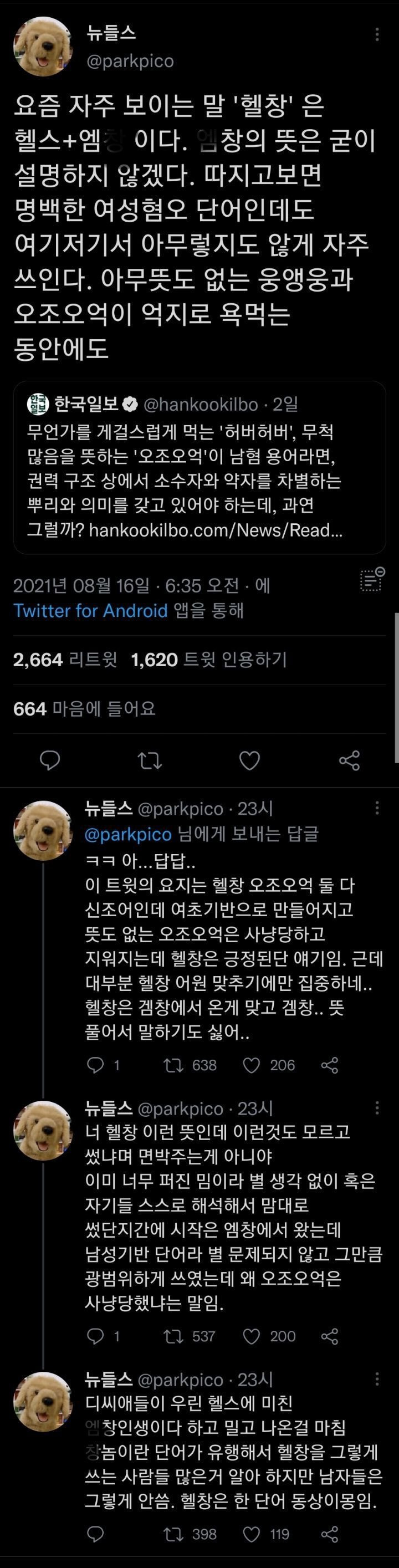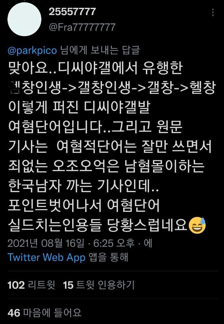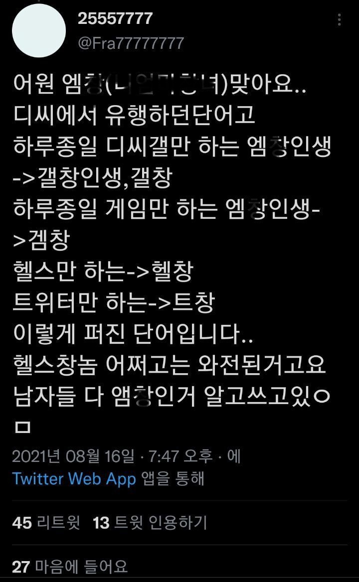 [기타]헬창 뜻 알아??? 작성자금동반가사유상|작성시간24.07.25|조회수44,897 목록 댓글 431 글자크기 작게가 글자크기 크게가 출처: 여성시대 금동반가사유상알고보니 여혐단어여시에서는 다른 의미로 쓰지만굳이 쓸 필요 없어보임 다음검색 현재 게시글 추가 기능 열기 북마크 공유하기 신고 센터로 신고 댓글 댓글 431 댓글쓰기 답글쓰기 댓글 리스트 작성자내가야 | 작성시간 24.07.26 헬스창놈이 아니라고!? 작성자뷰부 | 작성시간 24.07.26 헬스 창놈으로 바뀐지 오억년됨 작성자맹구짱돌 | 작성시간 24.07.26 나도 저것때매 안씀 작성자묘뮤 | 작성시간 24.07.31 헬스창놈인줄알았는데.. 작성자알람쥐 | 작성시간 24.08.07 창놈인줄.. 댓글 전체보기