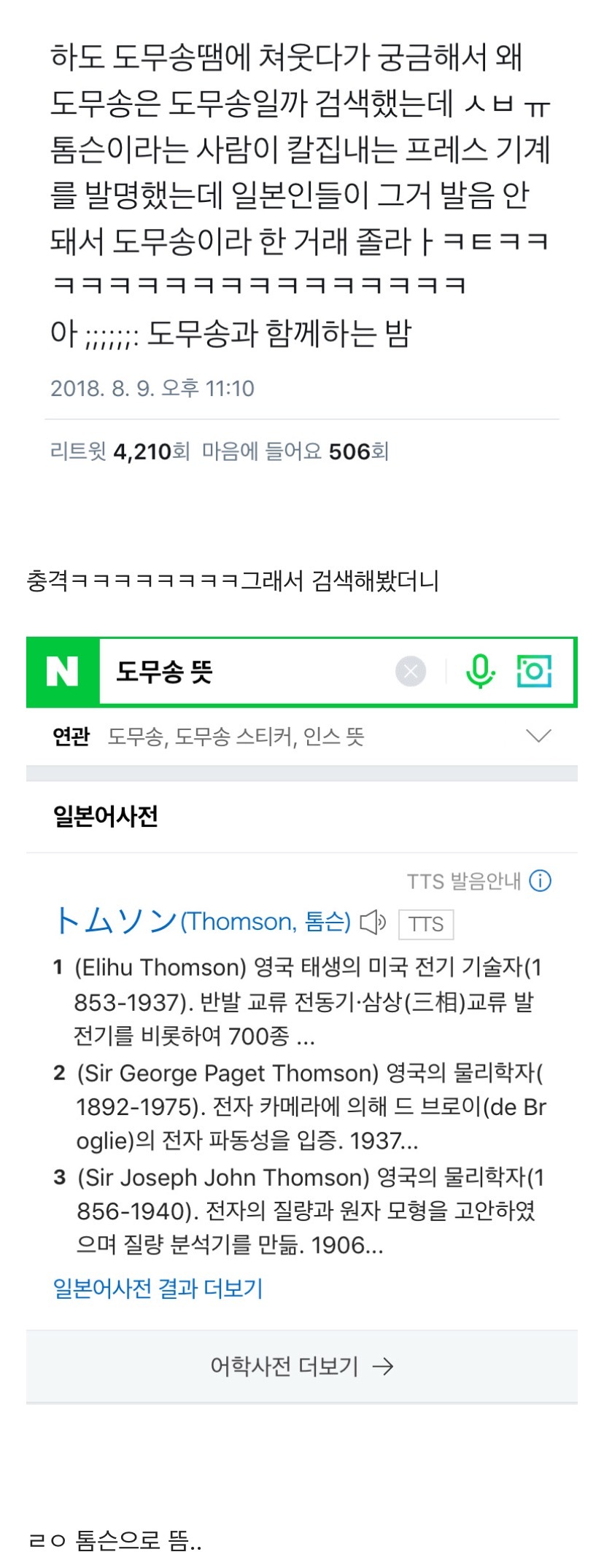 작성자정신차리고똑바로살아 작성시간 24.07.26 아 톰슨 작업이 사람 이름에서 온거였구나 ㅁㅊ 도무송 개충격ㅋㅋㅋㅋㅋㅋ