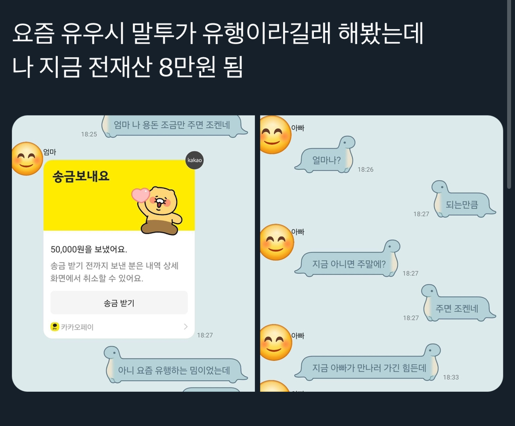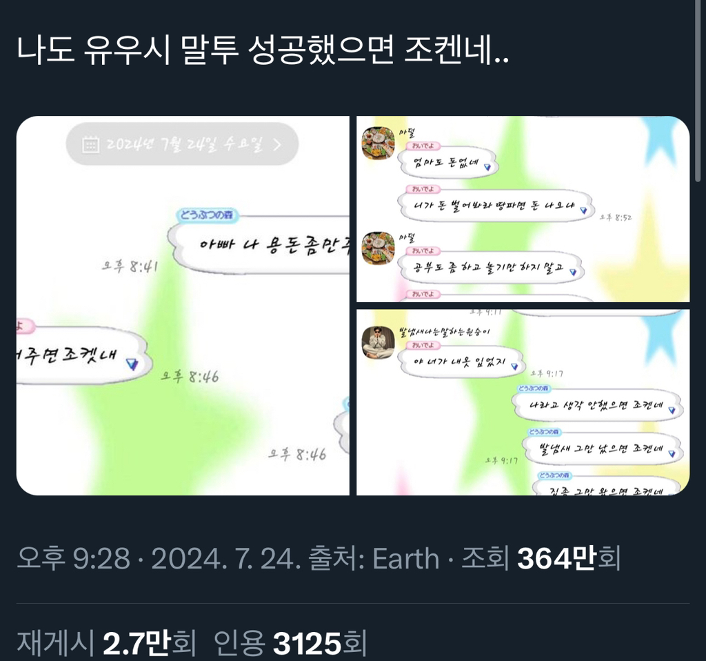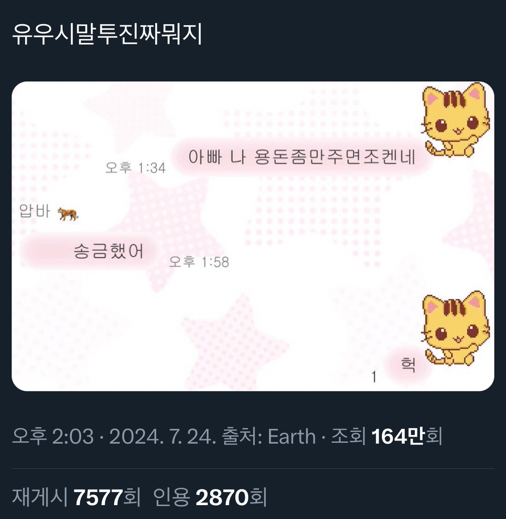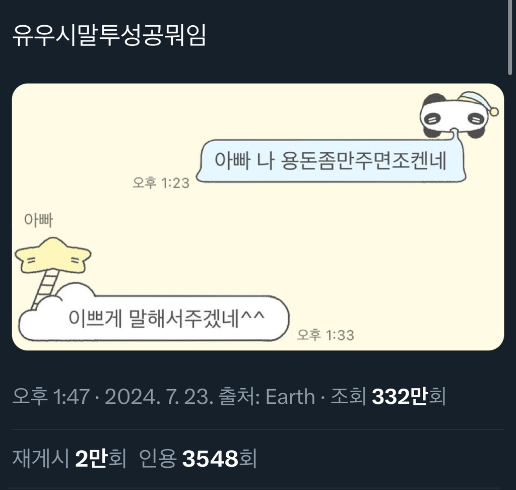 원본은 이거라는데 이말투쓰고 용돈 받은트윗 알티타고 더 퍼진듯ㅋㅋㅋㅋㅋ