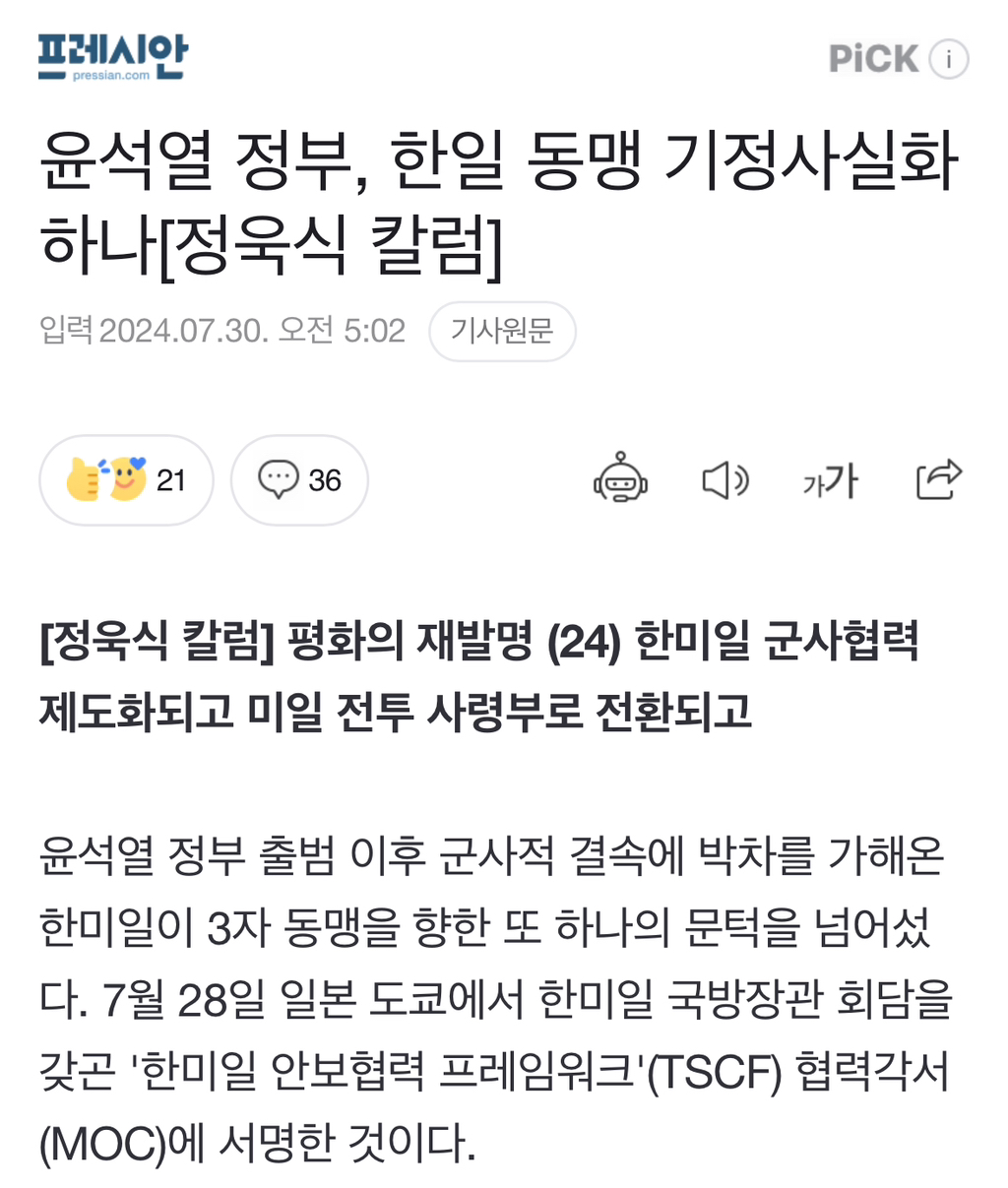 [여시뉴스데스크]윤석열 정부, 한일 동맹 기정사실화하나 작성자소리앙|작성시간24.07.30|조회수1,287 목록 댓글 37 글자크기 작게가 글자크기 크게가 출처: https://naver.me/58NOMdgR윤석열 정부, 한일 동맹 기정사실화하나[정욱식 칼럼]평화의 재발명 (24) 한미일 군사협력 제도화되고 미일 전투 사령부로 전환되고 윤석열 정부 출범 이후 군사적 결속에 박차를 가해온 한미일이 3자 동맹을 향한 또 하나의 문턱을 넘어섰다. 7월 28n.news.naver.com전문출처 다음검색 현재 게시글 추가 기능 열기 북마크 공유하기 신고 센터로 신고 댓글 댓글 37 댓글쓰기 답글쓰기 댓글 리스트 작성자느개비코노에서도우미불러달라고행패 | 작성시간 24.07.30 이새끼 뽑은 ㅂㅅ들 다 자결해라 작성자바오가좍 | 작성시간 24.07.30 아니 또 뭐라는거야 작성자왜겠냐고 | 작성시간 24.07.30 제발 ㅠ 작성자세상에나아마상에나 | 작성시간 24.07.30 왜 조용하냐고 작성자토깽이네토끼네마리 | 작성시간 24.07.30 나라 생각 안하고 존나 지멋대로네진짜 개또라이임 댓글 전체보기