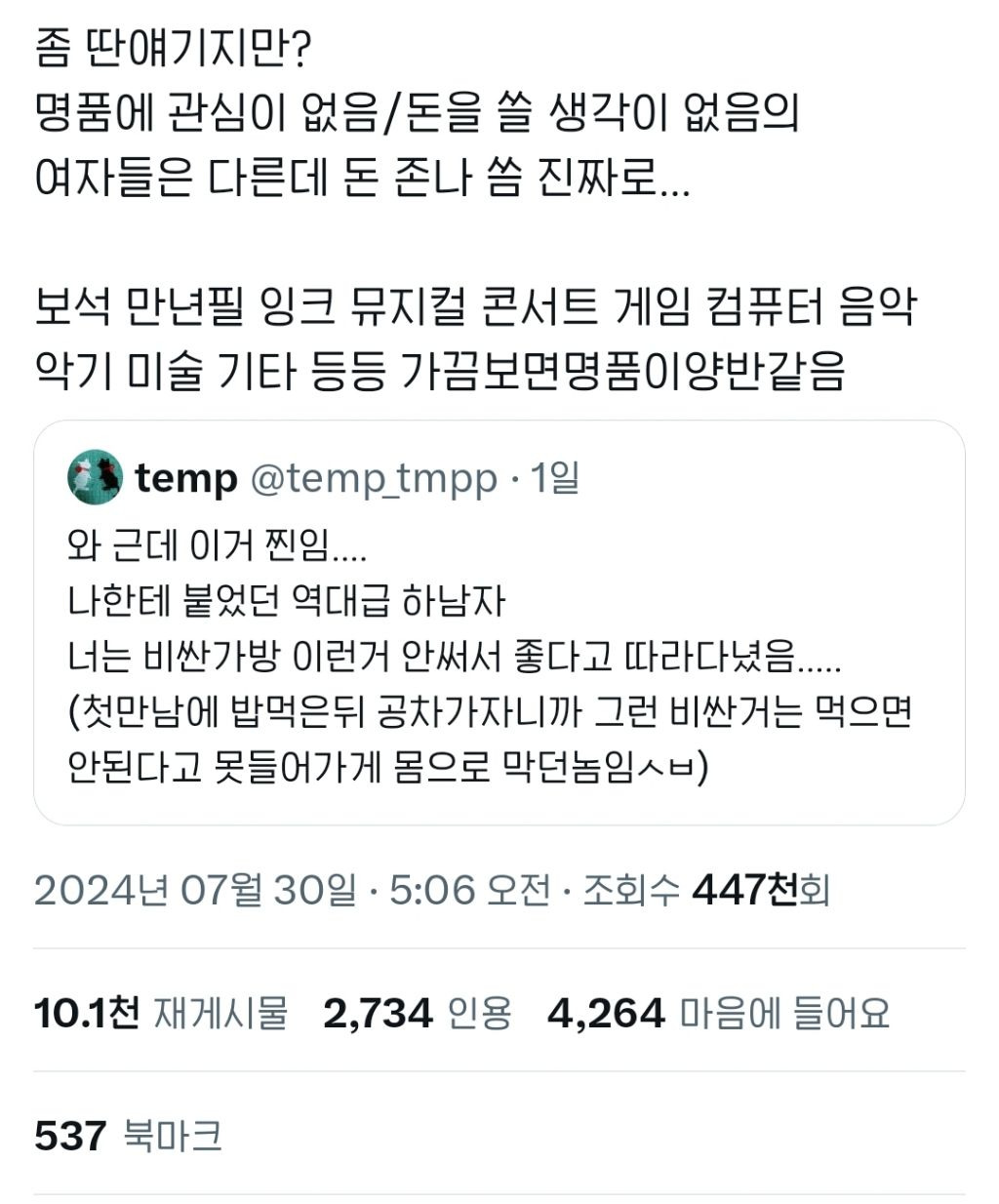 [흥미돋]명품에 관심이 없음/돈을 쓸 생각이 없음의 여자들은 다른데 돈 존나 씀 진짜로... 작성자아이디얼|작성시간24.07.30|조회수23,936 목록 댓글 212 글자크기 작게가 글자크기 크게가 출처: https://x.com/literally_owl/status/1818015362526626122?t=HThB97I9d62R_7hp6dIr3g&s=19X의 올빼미님(@literally_owl)좀 딴얘기지만? 명품에 관심이 없음/돈을 쓸 생각이 없음의 여자들은 다른데 돈 존나 씀 진짜로... 보석 만년필 잉크 뮤지컬 콘서트 게임 컴퓨터 음악 악기 미술 기타 등등 가끔보면명품이양반같x.com 다음검색 현재 게시글 추가 기능 열기 북마크 공유하기 신고 센터로 신고 댓글 댓글 212 댓글쓰기 답글쓰기 댓글 리스트 작성자물살이가될래 | 작성시간 24.08.01 ...ㅋㅋㅋㅋㅋㅋㅋ게임... 작성자버석한잠옷 | 작성시간 24.08.01 ㅅㅂ 난 미쳐있는게없는데 왜 거지지 작성자스투키엔선풍기를 | 작성시간 24.08.01 ㅋㅋㅋㅋㅋㅋㅋㅋ 개웃겨 맞아 작성자오렌지담요 | 작성시간 24.08.01 캠핑용품 미친... ㅠ 작성자MRB aria uy arbosa | 작성시간 24.08.01 난 캣맘하다 냥이들 데려오고싶어서 집샀음 ㅋㅋ다른데는 아예돈안써 댓글 전체보기