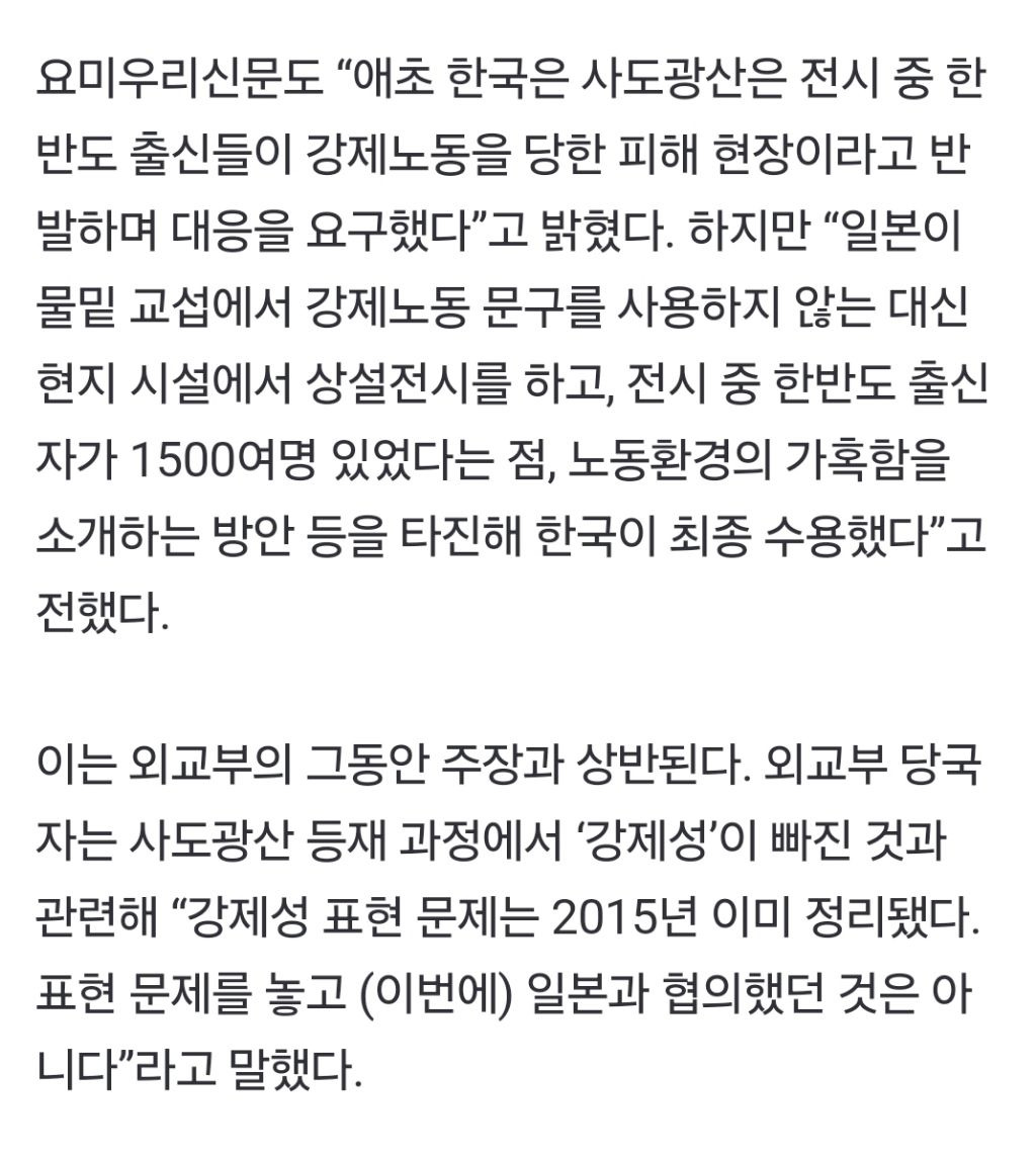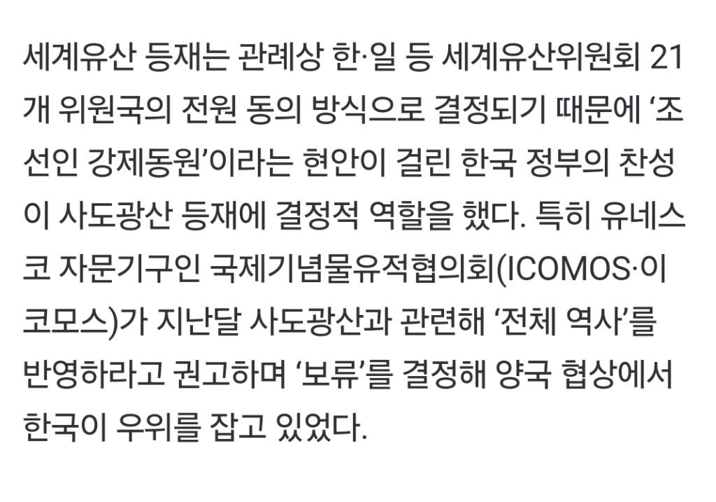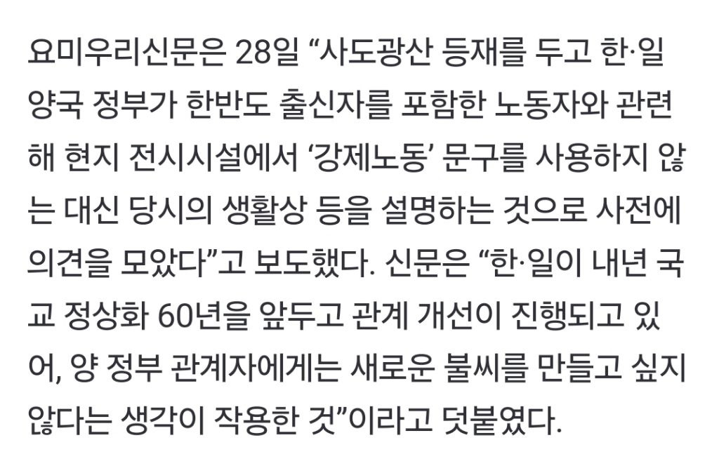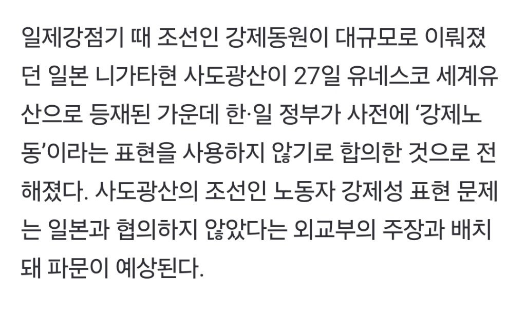 [스크랩] [여시뉴스데스크]일본 언론 “한·일, 사도광산 ‘강제노동’ 빼기로 사전 합의” 작성자한국더잘나갔으면좋겠다|작성시간24.07.30|조회수984 목록 댓글 43 글자크기 작게가 글자크기 크게가 출처: https://naver.me/FhUpTGNl일본 언론 “한·일, 사도광산 ‘강제노동’ 빼기로 사전 합의”일제강점기 때 조선인 강제동원이 대규모로 이뤄졌던 일본 니가타현 사도광산이 27일 유네스코 세계유산으로 등재된 가운데 한·일 정부가 사전에 ‘강제노동’이라는 표현을 사용하지 않기로 n.news.naver.com전체 내용은 출처에서 확인하기너무 빡쳐서 숨이 잘 안쉬어지네 다음검색 스크랩 원문 : *여성시대* 차분한 20대들의 알흠다운 공간 현재 게시글 추가 기능 열기 북마크 공유하기 신고 센터로 신고 댓글 댓글 43 댓글쓰기 답글쓰기 댓글 리스트 작성자더있다 | 작성시간 24.07.30 미친 친일도 아니야 진짜 숭일임 ㅅㅂ 굴욕적이야 작성자대표님 | 작성시간 24.07.30 이..야...... 작성자후로다이엇터 | 작성시간 24.07.30 아 미친 ㅅㅂ 올림픽 틈타서 뭔짓거리를.. 작성자아바라주이소 | 작성시간 24.07.30 와 작성자알뚫괴의신부 | 작성시간 24.07.31 어떤 한국인이 합의를 한건데ㅜㅠㅠㅠㅠㅠ 댓글 전체보기