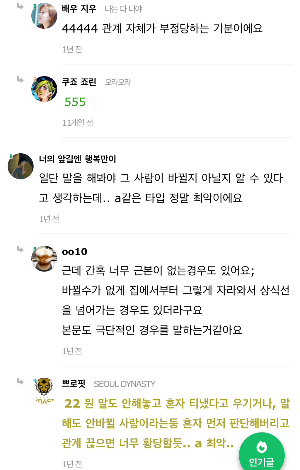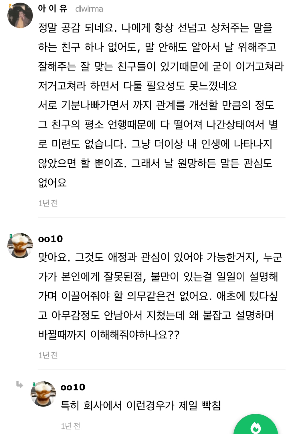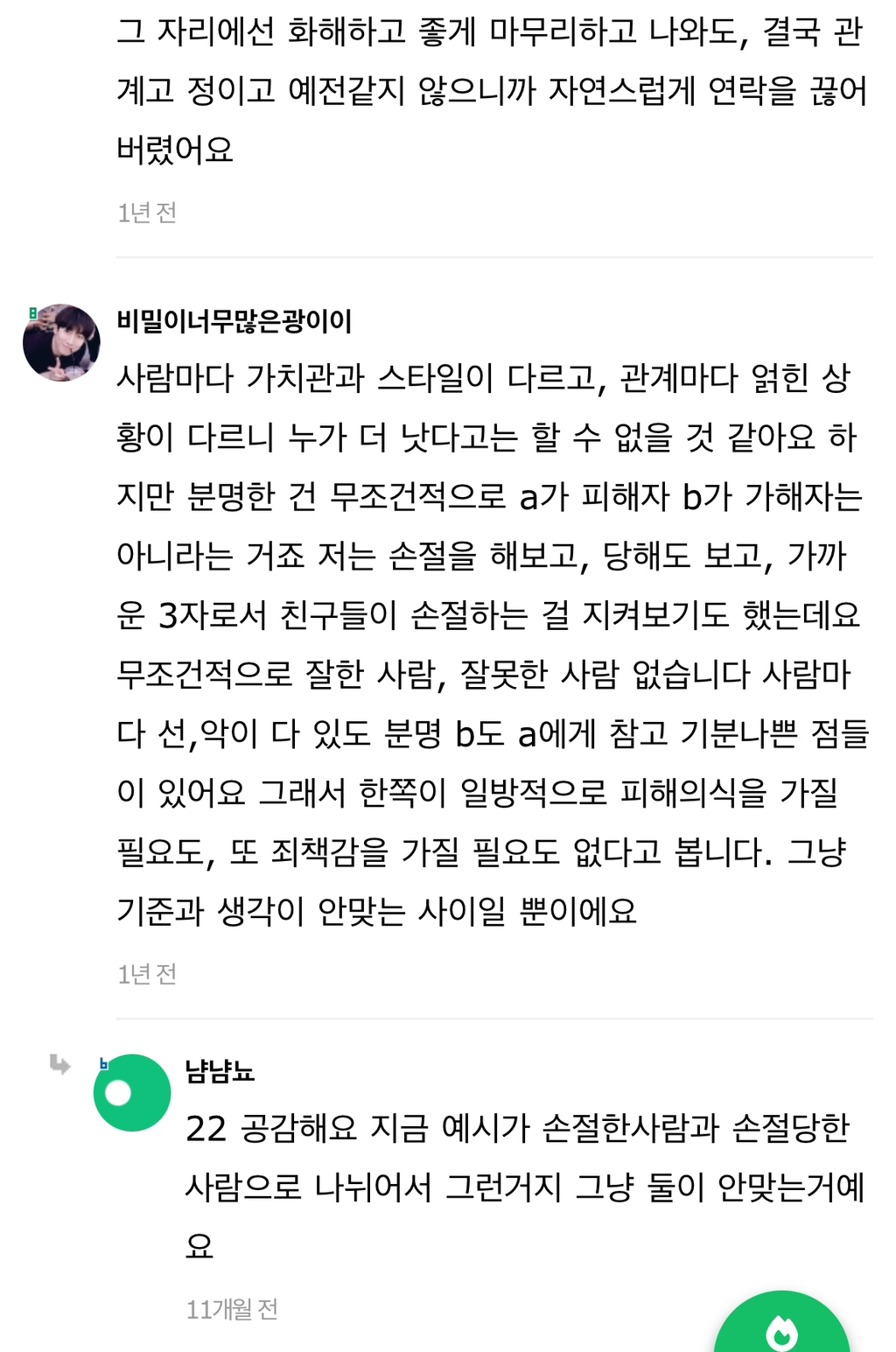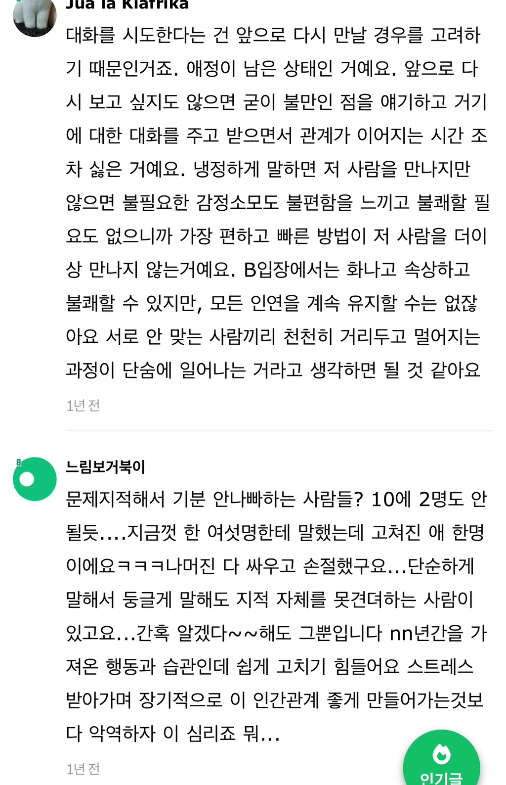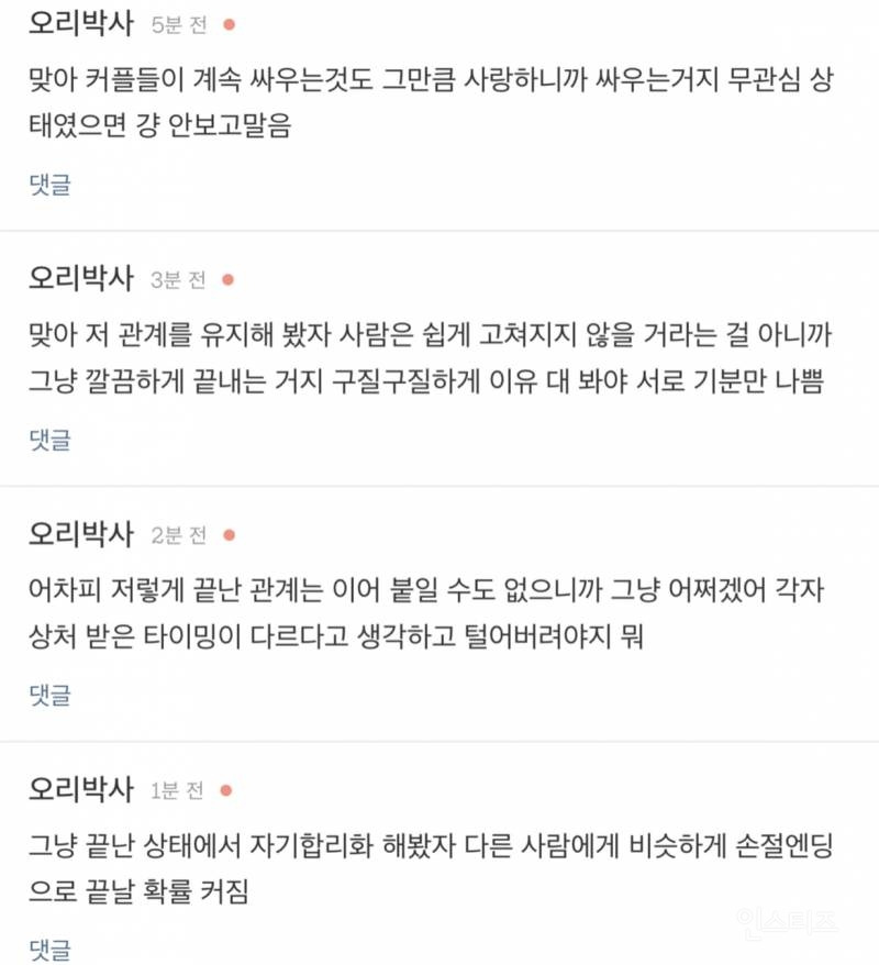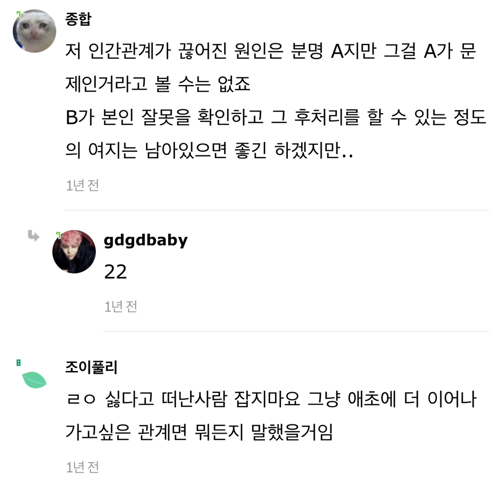 작성자습시도발 작성시간 24.07.30 말은해볼수있지않냐느니 이러쿵저러쿵하는거자체가 안맞는거야 그냥 끝날인연이다 하고끝내~ 이어질관계는 애초에 갈등시작과함께 당사자둘이 맞대면을한다고 ㅋㅋㅋ