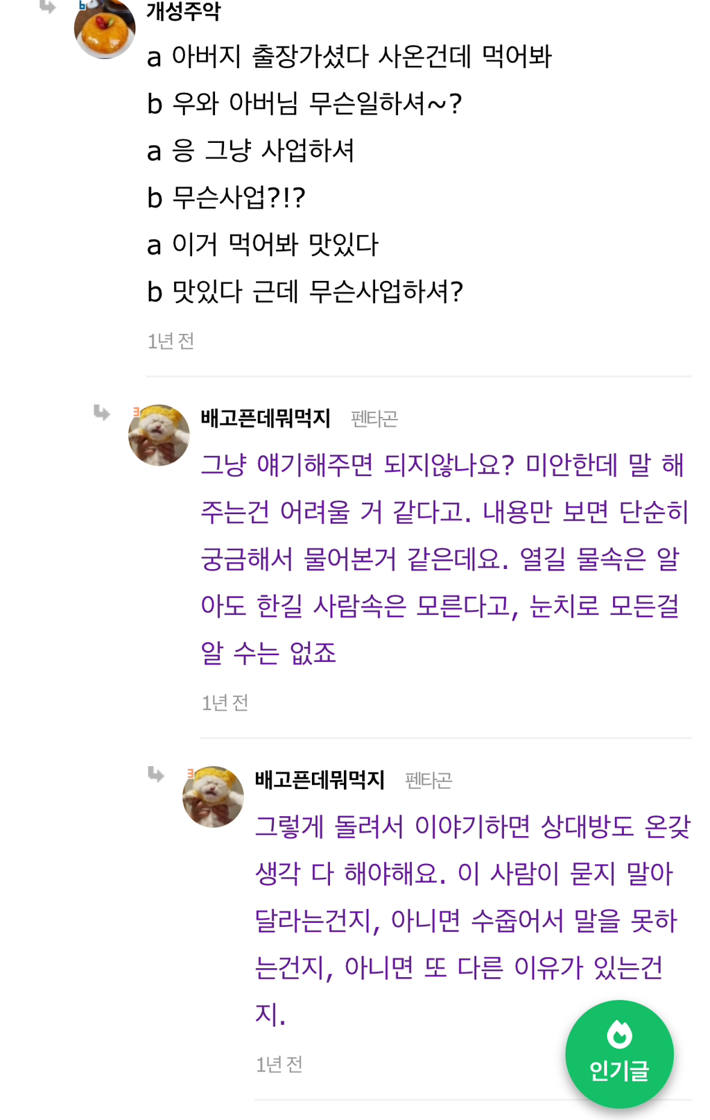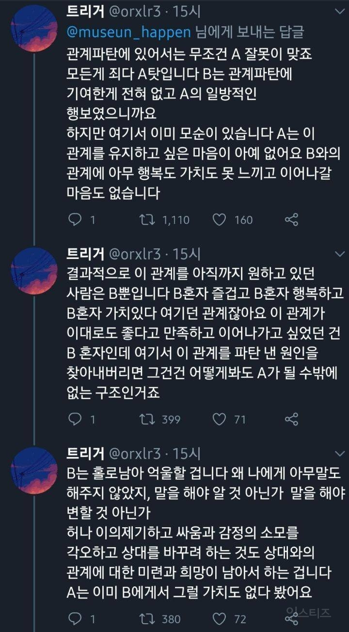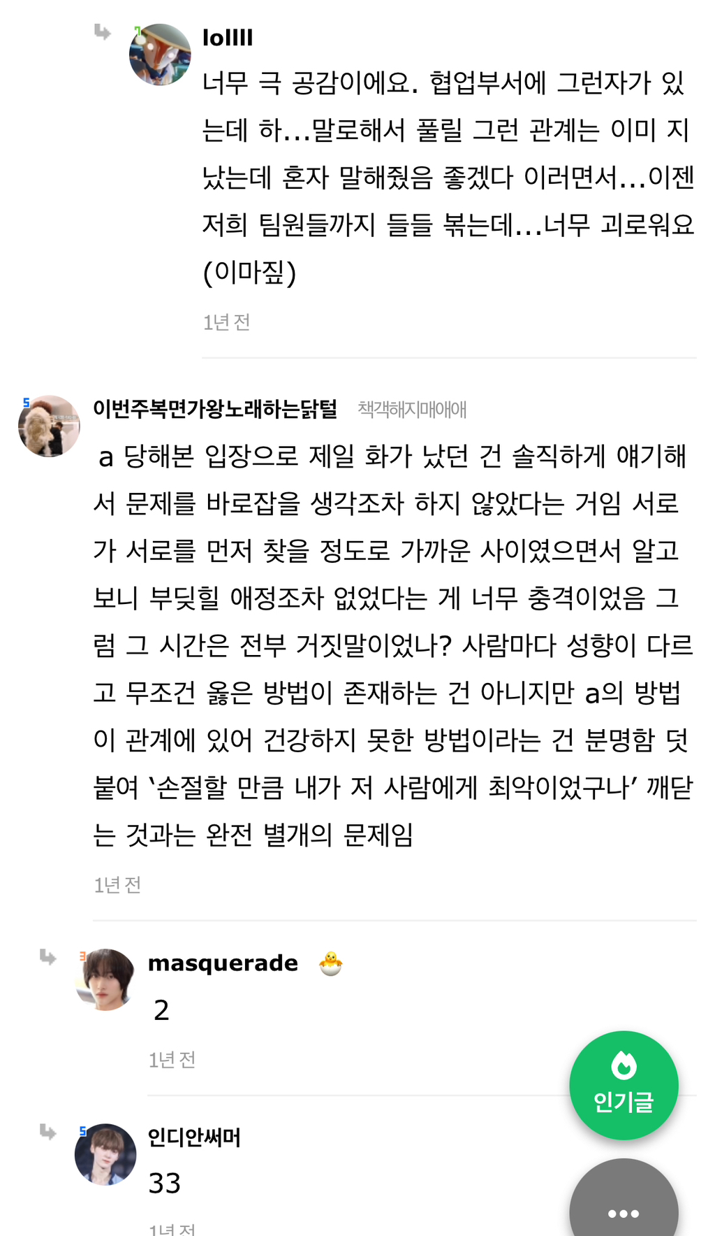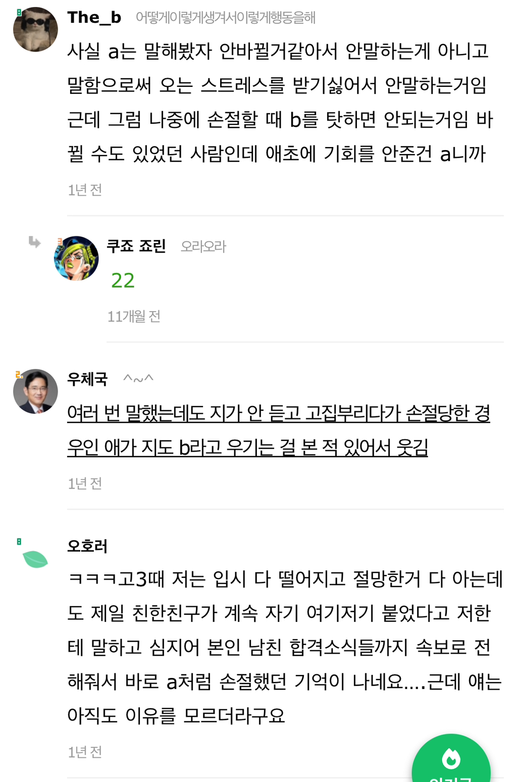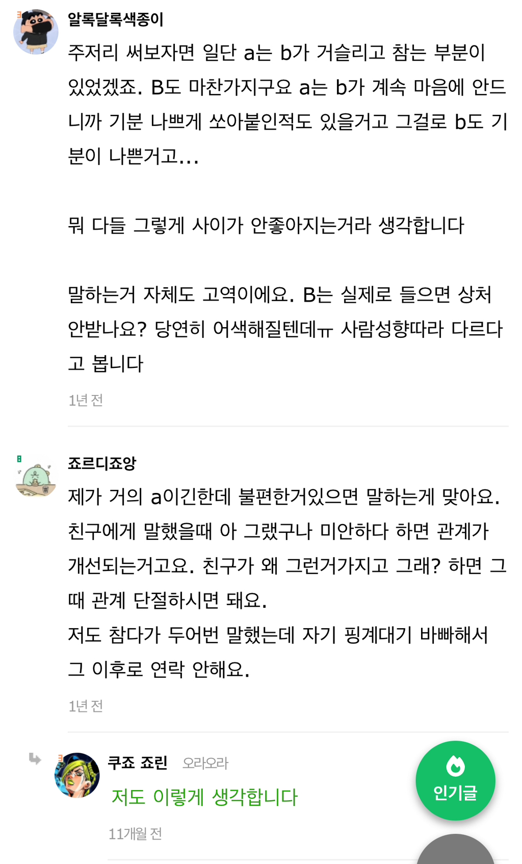 작성자습시도발 작성시간 24.07.30 말은해볼수있지않냐느니 이러쿵저러쿵하는거자체가 안맞는거야 그냥 끝날인연이다 하고끝내~ 이어질관계는 애초에 갈등시작과함께 당사자둘이 맞대면을한다고 ㅋㅋㅋ