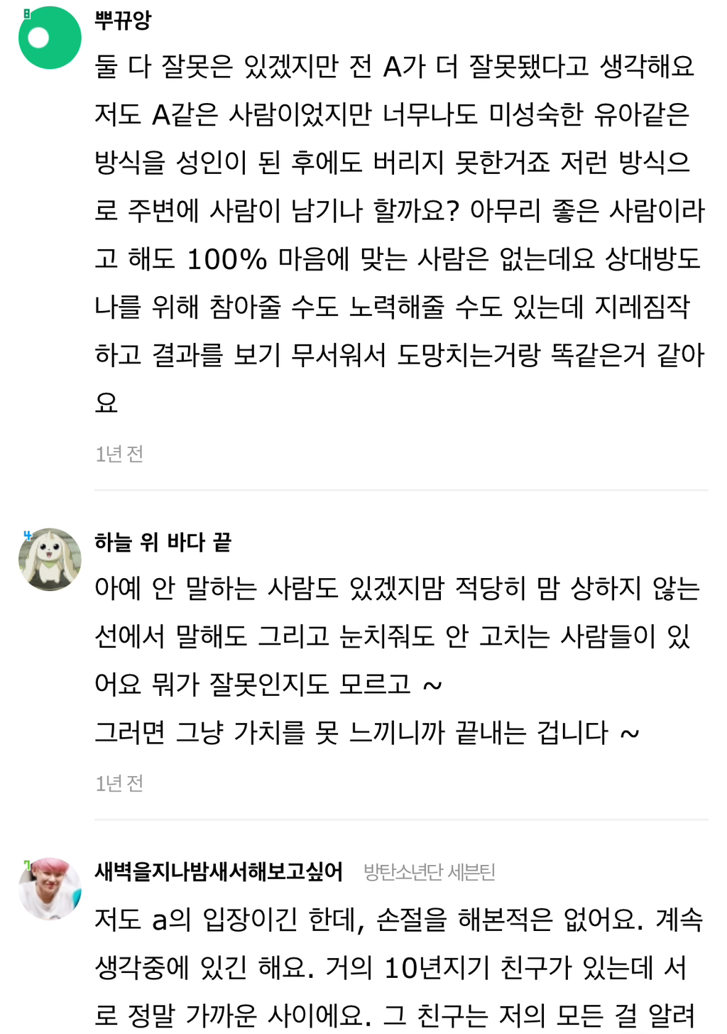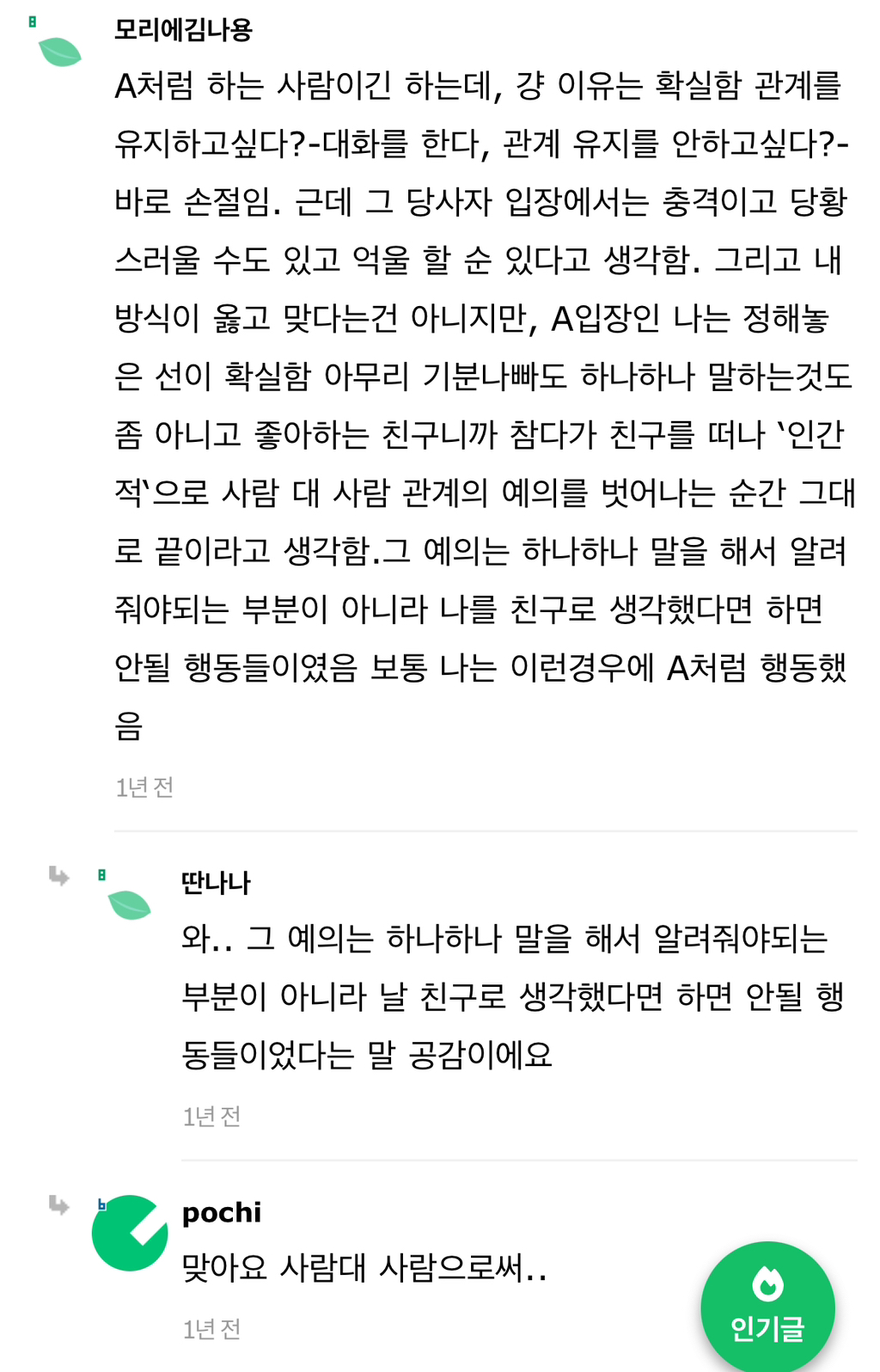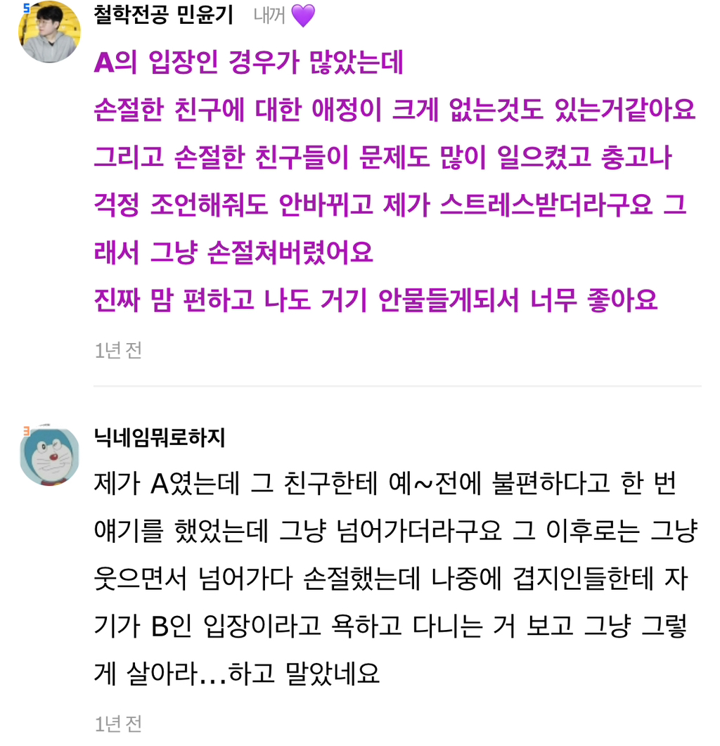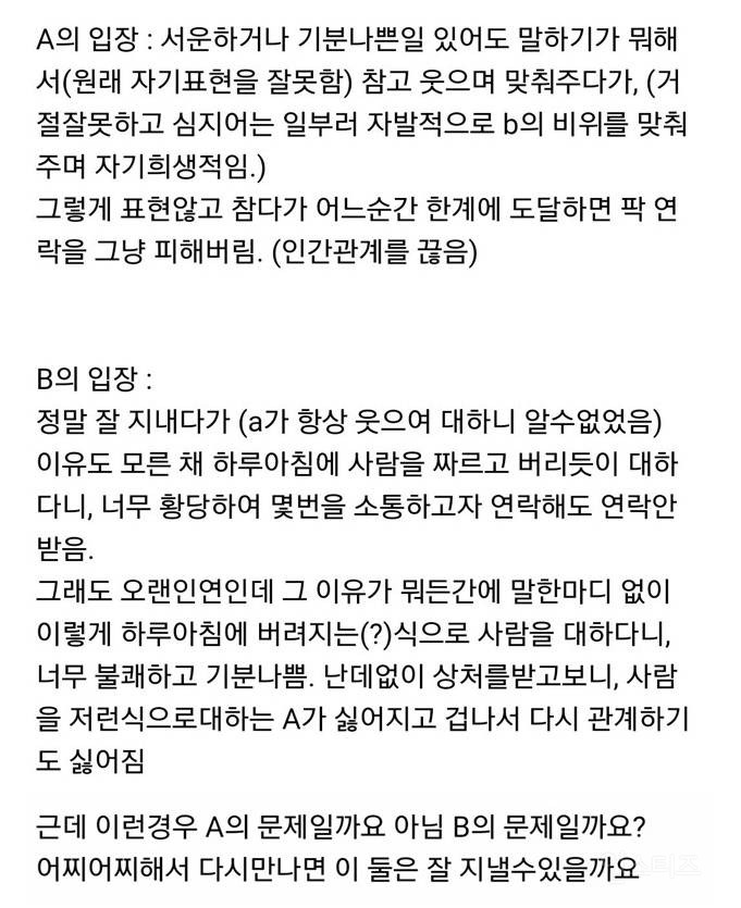 작성자보노보노^^ 작성시간 24.07.31 A라고 다 저런식으로 손절할까? 그리고 사회생활하면서 상대의 무례함을 일일이 말로 설명해줘야아나? 말해서 좋게 받아들이는 경우도 별로 없었고. 아무리 언질을하고 티를내고 짜증도내고 회피도 해도 말로 하나하나 곱씹어주지 않으면 말하지않고 손절친거래. 누가 성숙하지 못한건지
