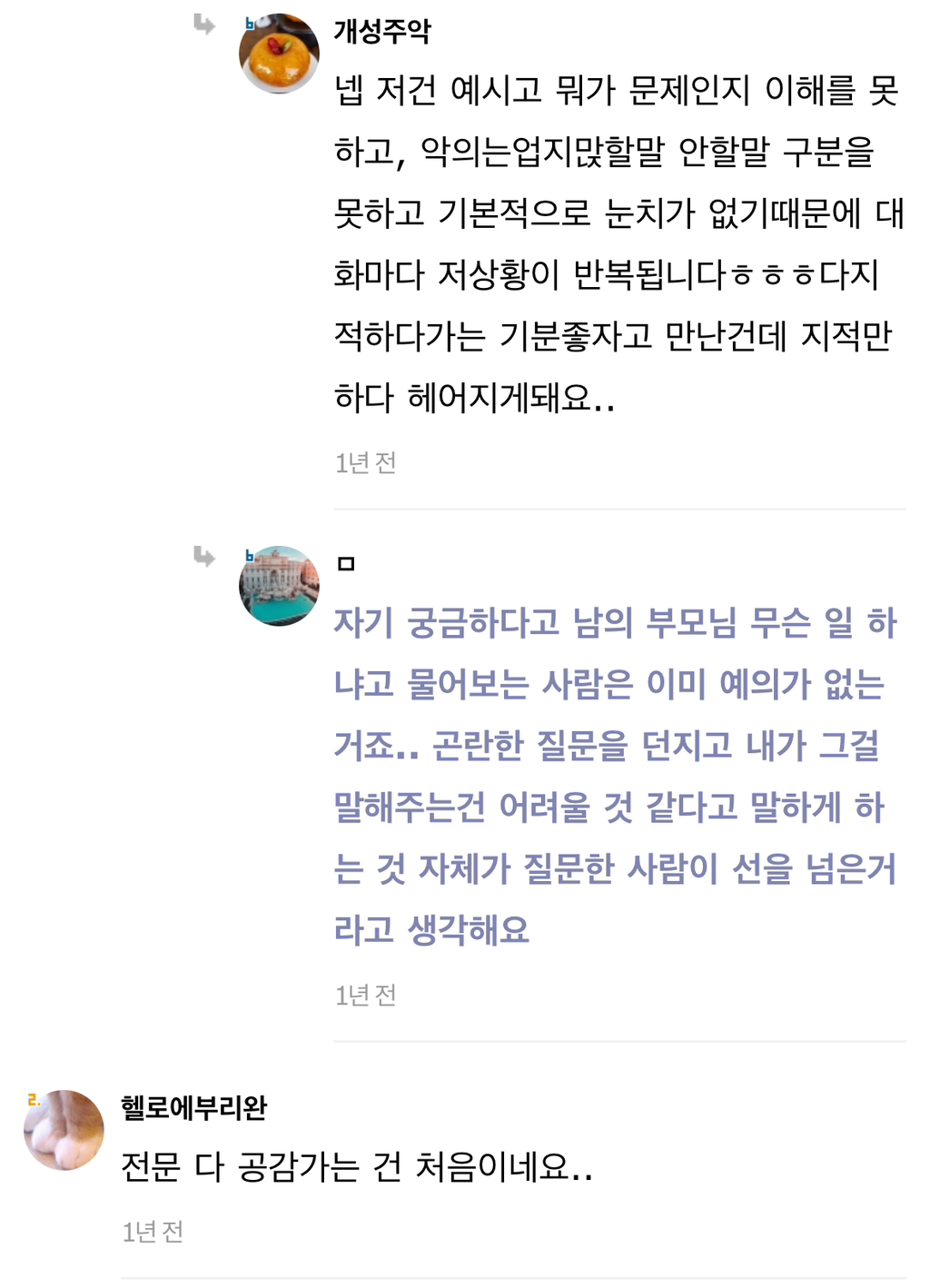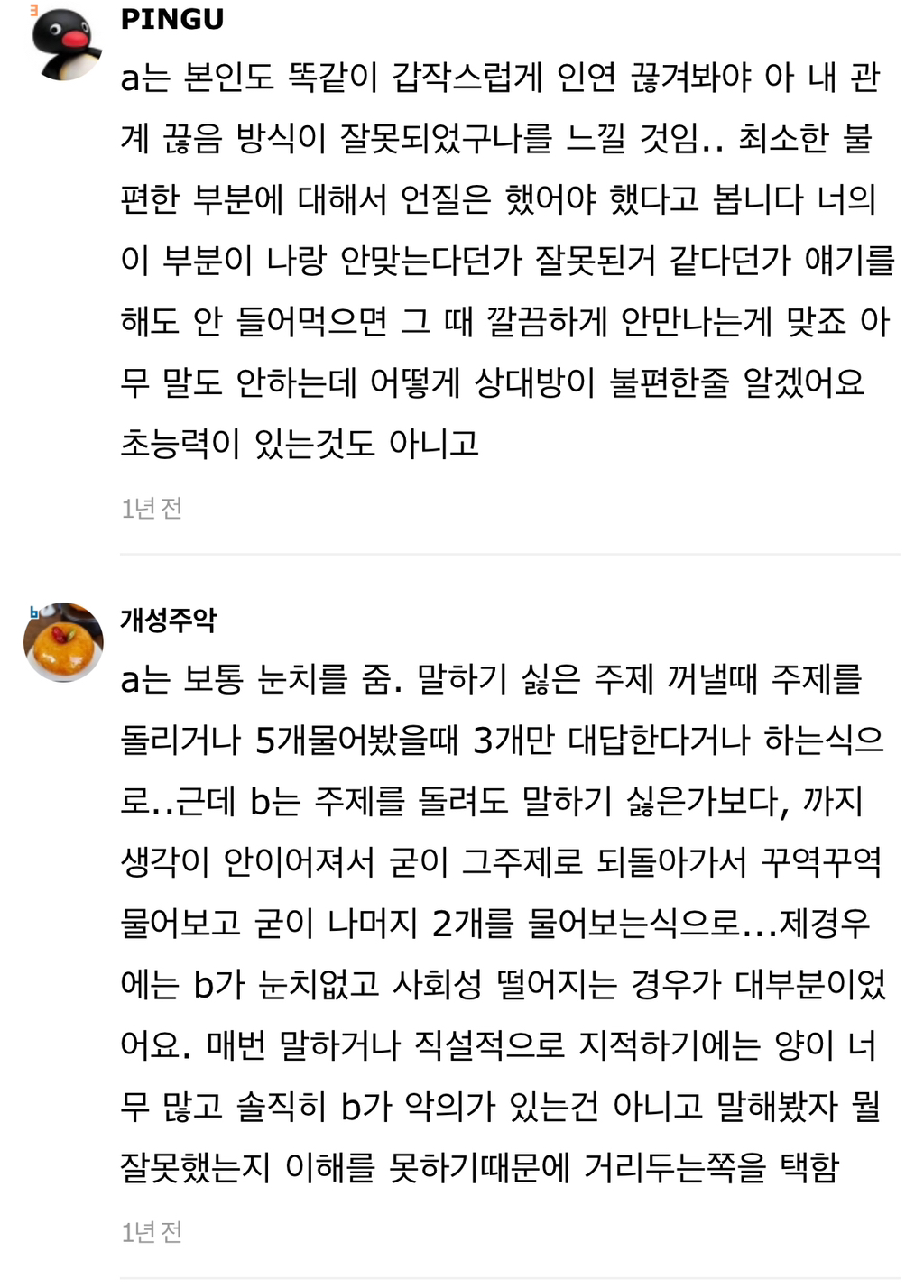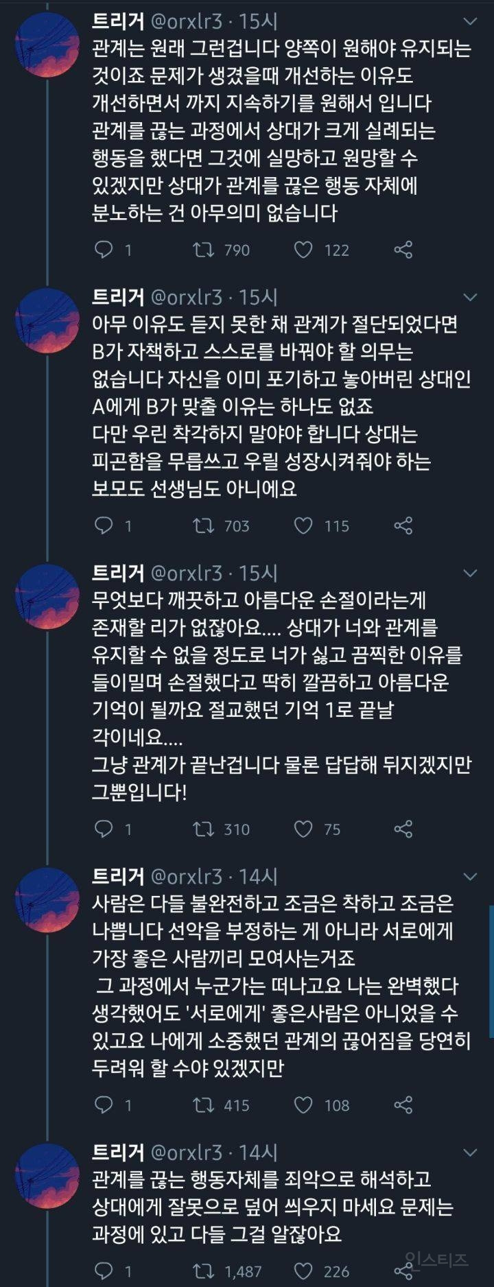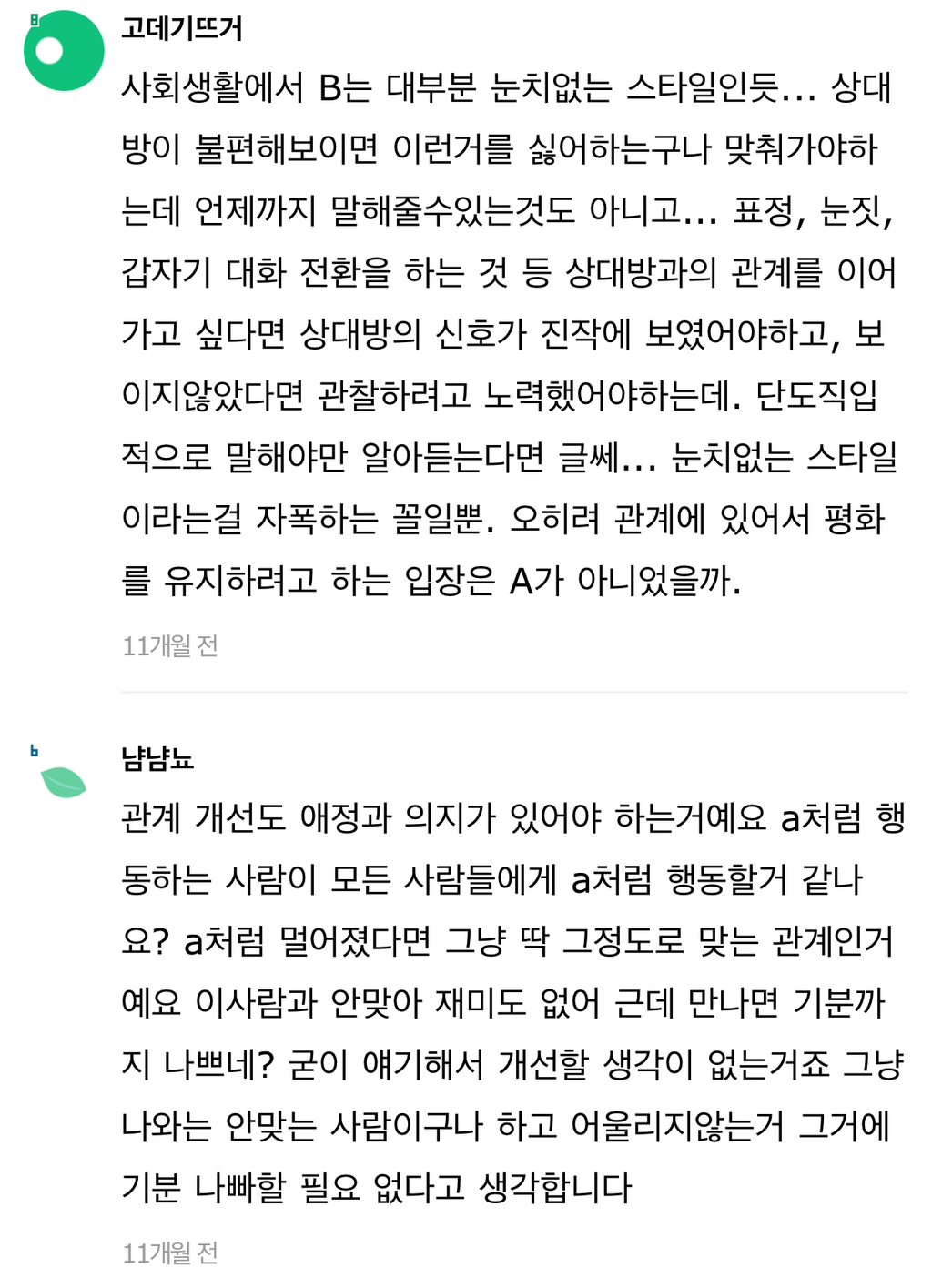 작성자보노보노^^ 작성시간 24.07.31 A라고 다 저런식으로 손절할까? 그리고 사회생활하면서 상대의 무례함을 일일이 말로 설명해줘야아나? 말해서 좋게 받아들이는 경우도 별로 없었고. 아무리 언질을하고 티를내고 짜증도내고 회피도 해도 말로 하나하나 곱씹어주지 않으면 말하지않고 손절친거래. 누가 성숙하지 못한건지