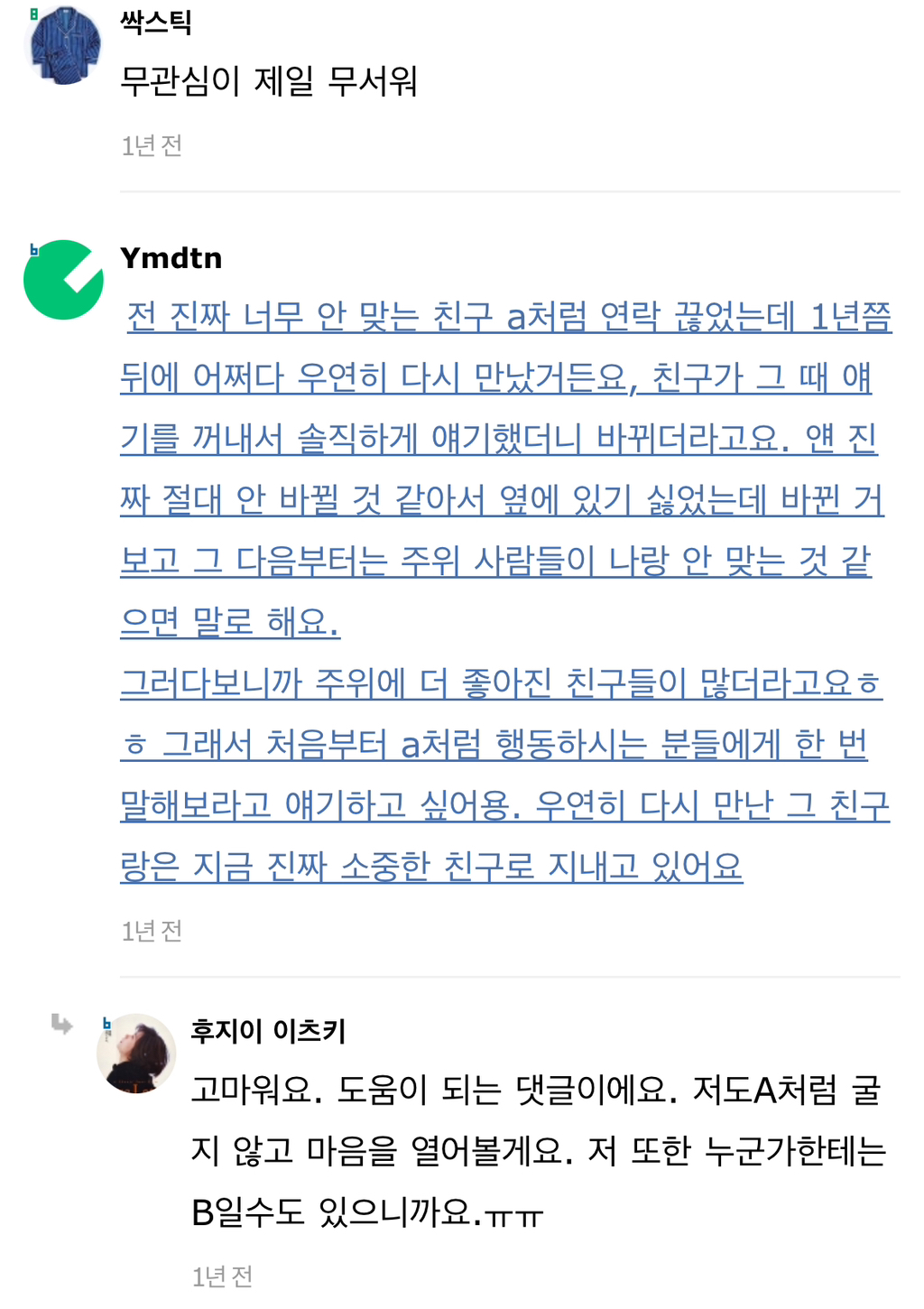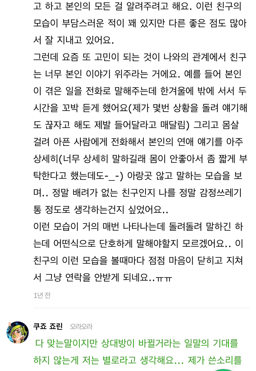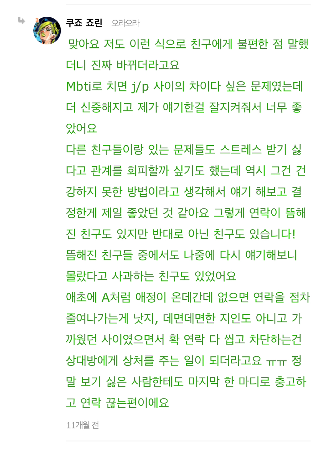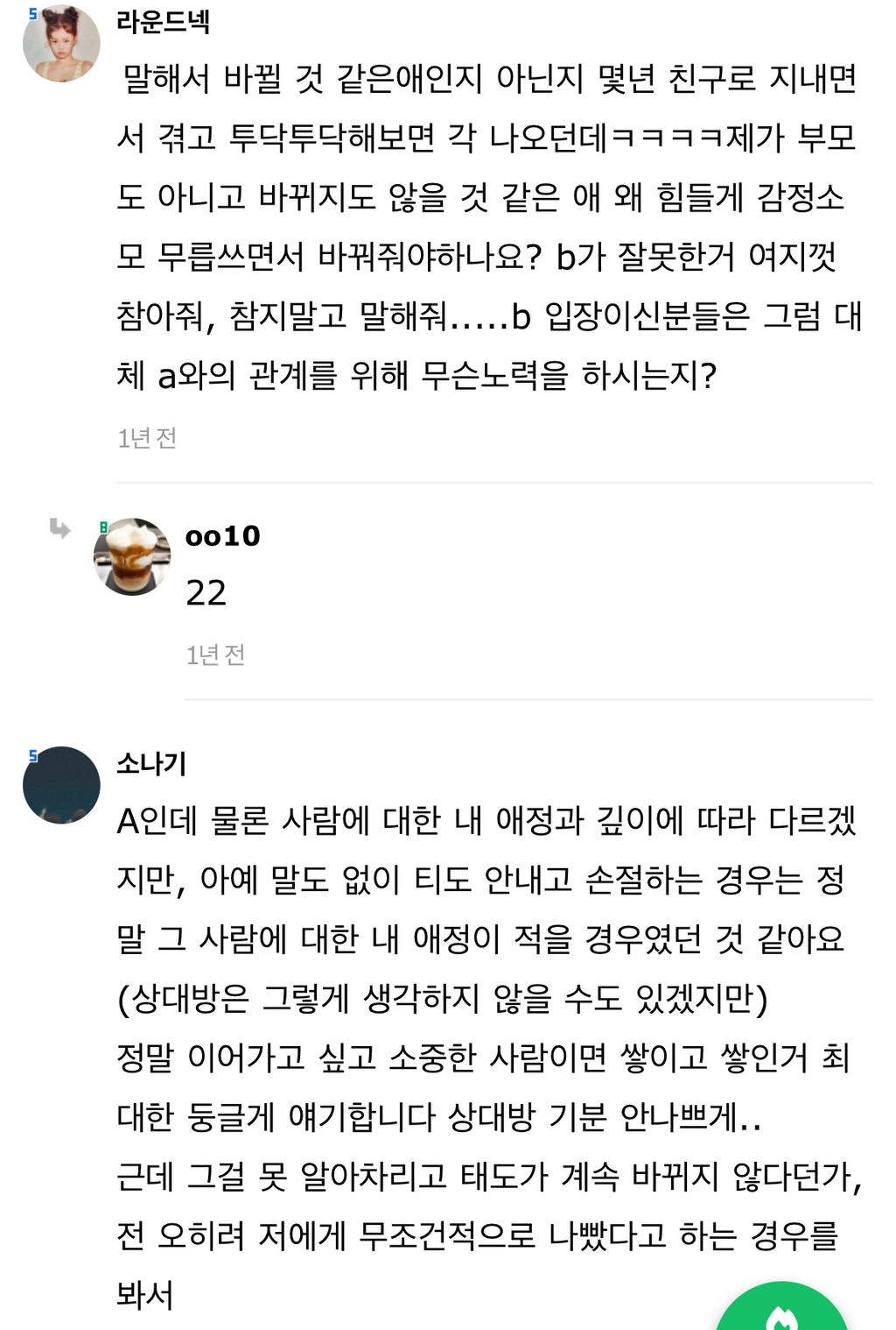 작성자gold nose 작성시간 24.07.30 몇년간 말해도 안고쳐지니 2명은 그냥 잠수엔딩탐..참고로 한명은 8년 한명은 6년간 간간히 말했음 결국은 ㅃㅂ하게 되더라