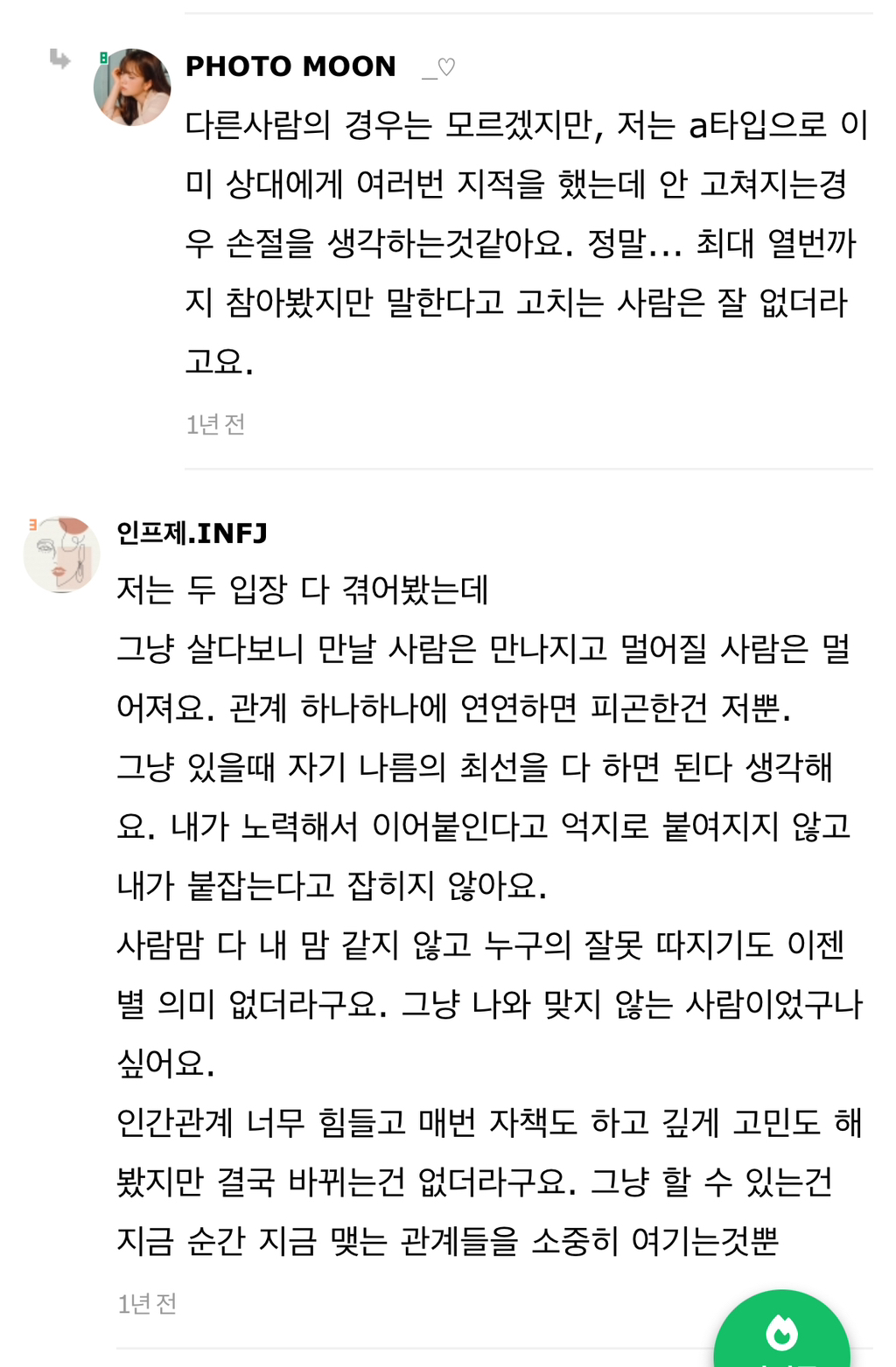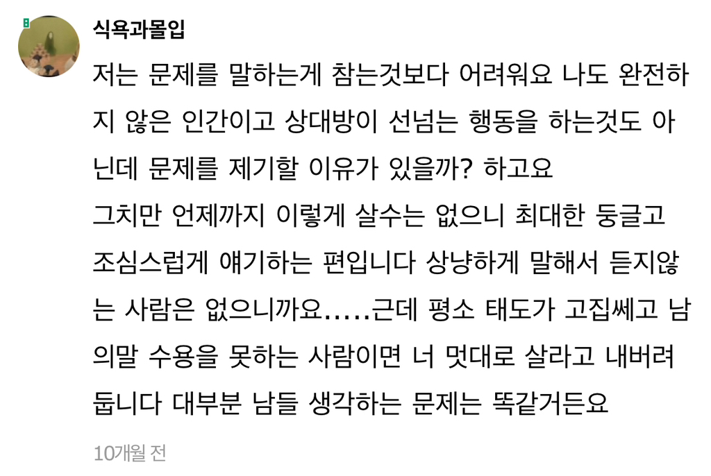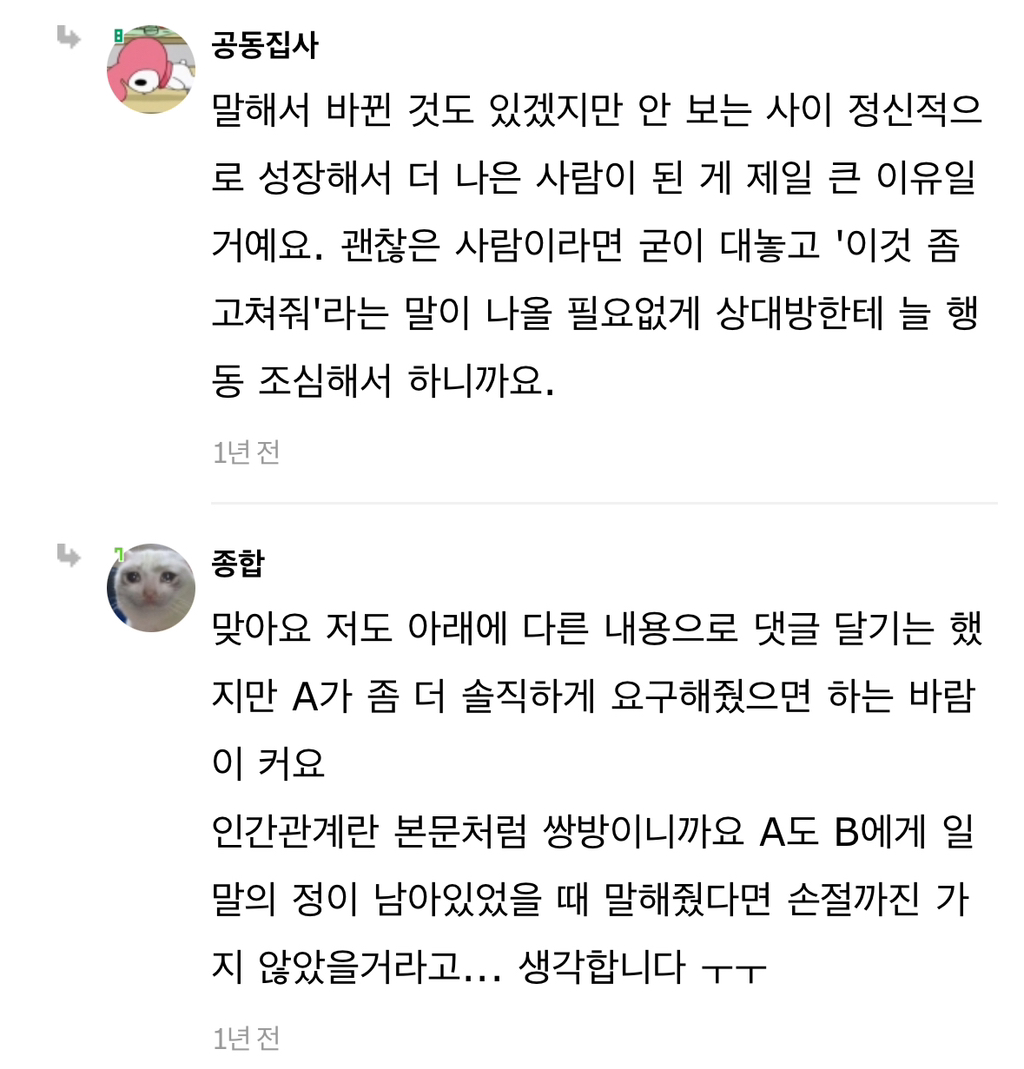 작성자cooI 작성시간 24.07.30 안맞는거 말해줘도 처음에만 달라지는거 같더니 결국 똑같더라고 그래서 그냥 연락 잠수함
