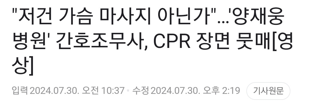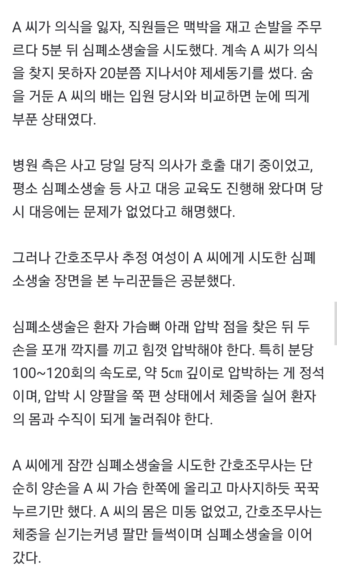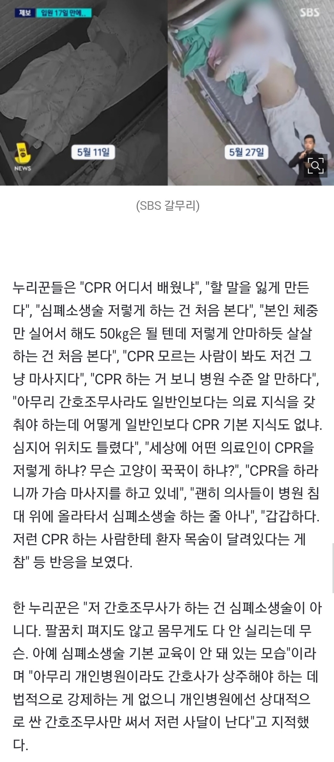작성자왼손으로그린별하나 작성시간 24.07.31 병원에서 일하는사람이 CPR도 못한다고..? 저런사람 고용한 병원이 문제지