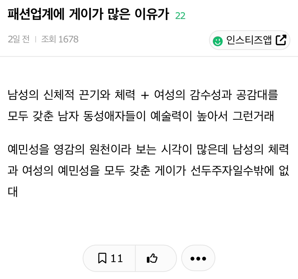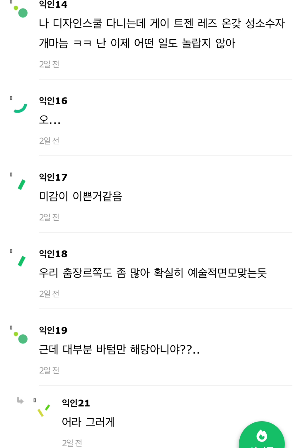 [기타]패션업계에 게이가 많은 이유가 작성자투로모나잇|작성시간24.08.01|조회수44,257 목록 댓글 202 글자크기 작게가 글자크기 크게가 출처: https://instiz.net/name_enter/92954720 다음검색 현재 게시글 추가 기능 열기 북마크 공유하기 신고 센터로 신고 댓글 댓글 202 댓글쓰기 답글쓰기 댓글 리스트 답댓글 작성자낡은피자 | 작성시간 24.08.02 222 작성자캯몰빵 | 작성시간 24.08.02 지는 하이힐 신을 일 없으니 더 가학적으로 하이힐 만들겠다던 게이가? 우웻 작성자하얀마음백범김구 | 작성시간 24.08.02 ?남자카르텔때문임 작성자박홍근 | 작성시간 24.08.03 뭔개솔ㅋㅋ 현실은 민주킴이 우승자라고요^^ 작성자맥북 | 작성시간 24.08.03 지랄ㅋ 지들끼리 카르텔만들고 끌어줘서그렇지좆같은 하이힐 이런거 다 게이들이 지들 안신는다고 만든거잖아 댓글 전체보기