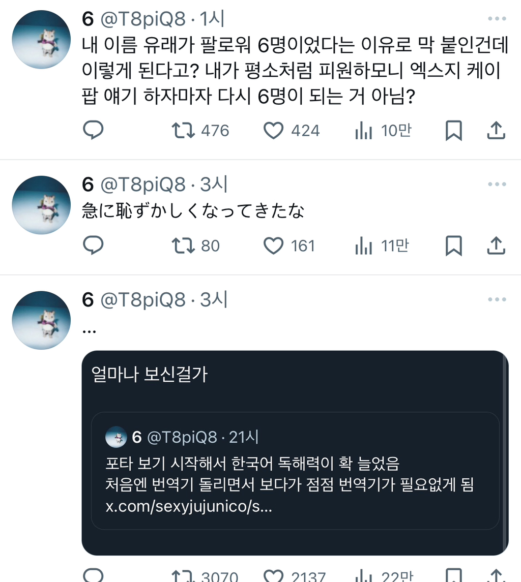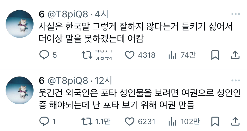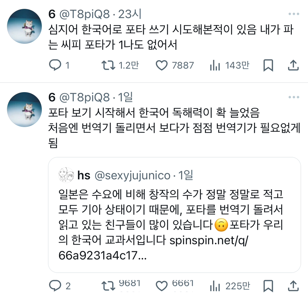 작성자강수혜 작성시간 24.08.02 이제 우리 창작물 수출국이라 너무 공급 없는 거 검색하면 외국 팬이 한글로 쓴 포타도 있음