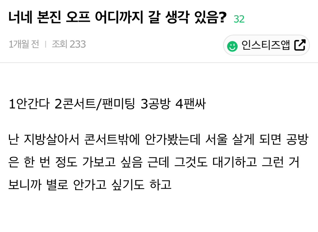 작성자만나러 갈게 데리러 갈게 작성시간 24.08.05 콘서트만.. 나머지는 내 시간 낭비 같음