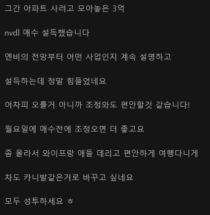 [스크랩] [흥미돋]와이프 설득해서 엔비디아 몰빵했다는 미국 주식 갤러리 유저 작성자flflf|작성시간24.08.06|조회수29,063 목록 댓글 56 글자크기 작게가 글자크기 크게가 6월 15일에 샀나봄..저때가 최고점이고현재 가격 반토막 넘게남ㄷㄷ하필 레버리지 넣어서 2배로 손해 다음검색 스크랩 원문 : 이종격투기 현재 게시글 추가 기능 열기 북마크 공유하기 신고 센터로 신고 댓글 댓글 56 댓글쓰기 답글쓰기 댓글 리스트 작성자잰니니 | 작성시간 24.08.06 저런글 쓰는 사람 특유의 희망에 가득차보이는 말투 ㅋㅋㅋㅋㅋ ㅜㅜ 작성자마동걸 | 작성시간 24.08.06 아파트 살 돈으로 주식을?? 작성자고양이준니기엽 | 작성시간 24.08.06 어이쿠... 작성자뫃 해체해 | 작성시간 24.08.06 시발 작성자밤팅팅 | 작성시간 24.08.06 에효 댓글 전체보기
