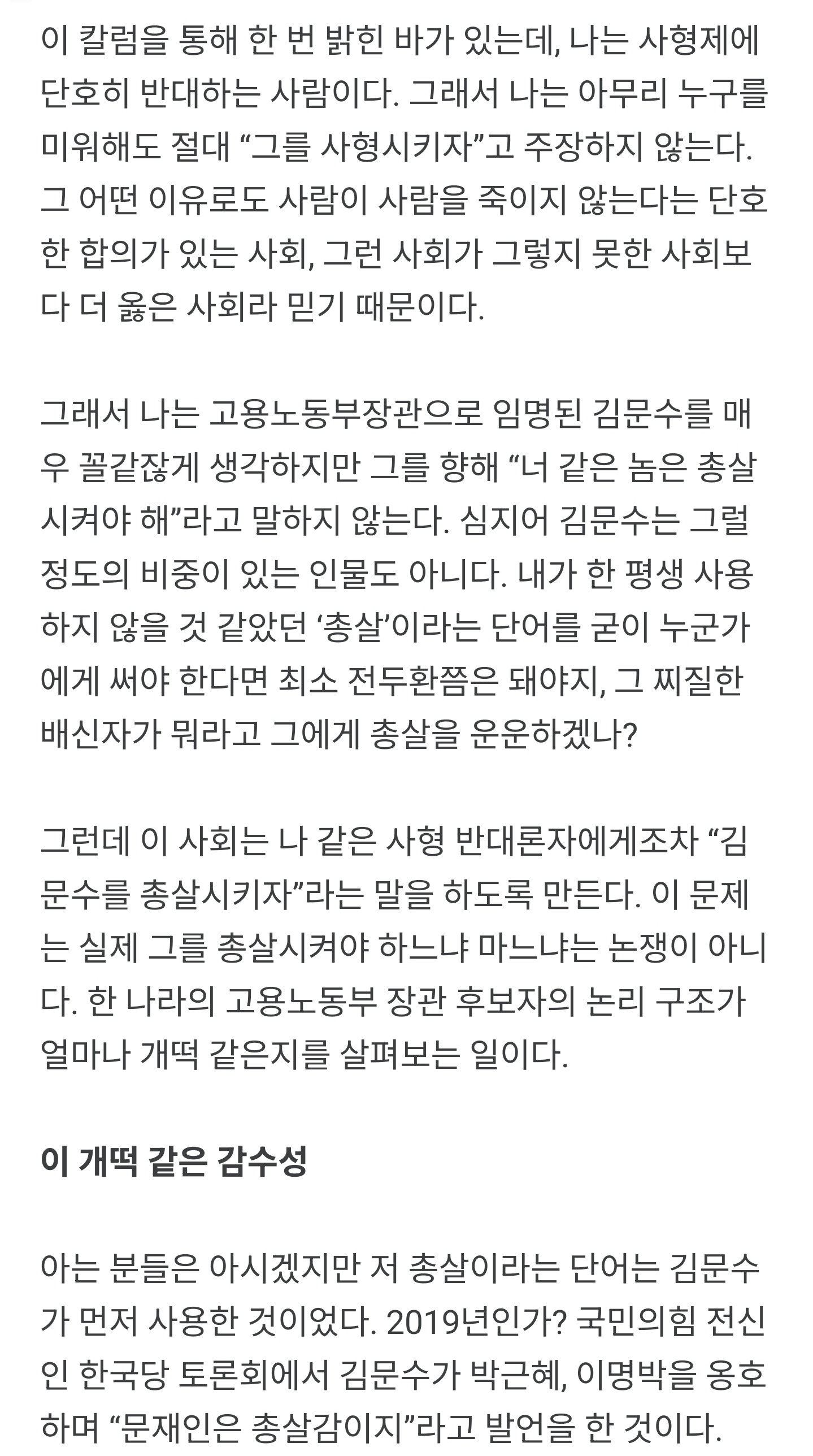 [여시뉴스데스크]그냥 김문수를 총살 시키자 작성자그랭ㅎ|작성시간24.08.06|조회수2,022 목록 댓글 5 글자크기 작게가 글자크기 크게가 출처: https://vop.co.kr/A00001658945.html[이완배 협동의 경제학] 그냥 김문수를 총살 시키자 vop.co.kr 다음검색 현재 게시글 추가 기능 열기 북마크 공유하기 신고 센터로 신고 댓글 댓글 5 댓글쓰기 답글쓰기 댓글 리스트 작성자옥수수수떡 | 작성시간 24.08.06 ㅋㅋㅋㅋㅋㅋ웃긴다 칼럼 작성자핸드폰동기화인간 | 작성시간 24.08.06 하 정말.....개크게 동의하는 바입니다.... 작성자뽀리신 | 작성시간 24.08.06 꼴같잖게 ㅋㅋㅋ 나라꼴 ㅅㅂ 김문수가 장관인 나라 작성자나이트윙 | 작성시간 24.08.06 칼럼 진짜 잘 읽힌닼ㅋㅋㅋㅋㅋ진짜 아직도 김문수가 정치판에 있는 나라꼴..ㅋㅋㅋㅋㅋㅋㅋ 작성자안타좀치셈 | 작성시간 24.08.06 동의합니다 댓글 전체보기
