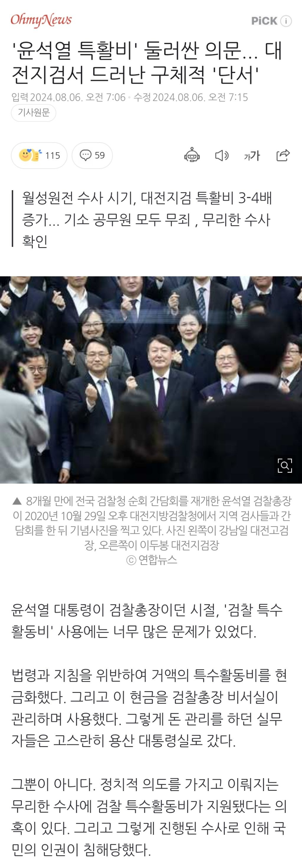 [여시뉴스데스크]'윤석열 특활비' 둘러싼 의문... 대전지검서 드러난 구체적 '단서' 작성자천리길|작성시간24.08.06|조회수783 목록 댓글 4 글자크기 작게가 글자크기 크게가 출처: https://naver.me/GQ1KC3wa'윤석열 특활비' 둘러싼 의문... 대전지검서 드러난 구체적 '단서'▲ 8개월 만에 전국 검찰청 순회 간담회를 재개한 윤석열 검찰총장이 2020년 10월 29일 오후 대전지방검찰청에서 지역 검사들과 간담회를 한 뒤 기념사진을 찍고 있다. 사진 왼쪽이 강남일 대전고n.news.naver.com이하 생략전문 출처로 다음검색 현재 게시글 추가 기능 열기 북마크 공유하기 신고 센터로 신고 댓글 댓글 4 댓글쓰기 답글쓰기 댓글 리스트 작성자네모고먐미 | 작성시간 24.08.06 진짜 너무 많은 문제야. 현금화? 하... 작성자메오브 | 작성시간 24.08.06 탄핵할게 이렇게 차고 넘치는데 왜 안돼 작성자current | 작성시간 24.08.06 특활비없애자걍 작성자자색고구머 | 작성시간 24.08.06 탄핵을못시키냐고 미쳤나 댓글 전체보기