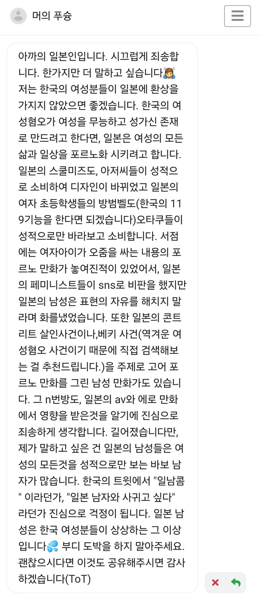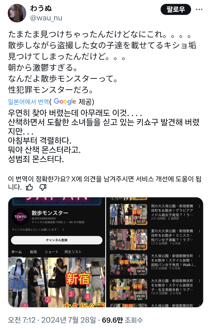 작성자망고씨머리 작성시간 24.08.06 몰카의 원조가 일본이야 ㅠㅠ정신차려 한녀들아..