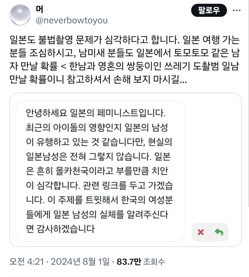 출처: https://twitter.com/neverbowtoyou/status/1818728776421064933?t=hbSxGetbIzeIoKGFNt5ugA&s=19