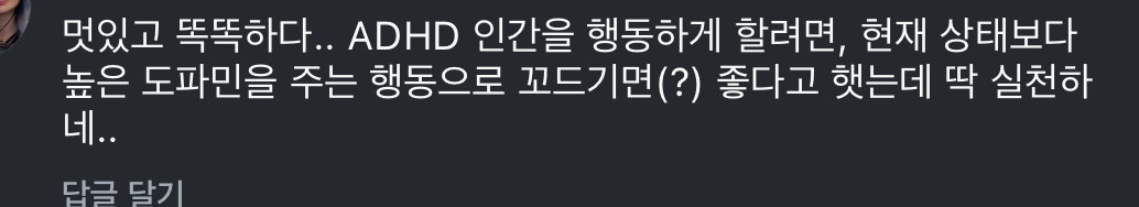 * 본인도 이러고싶어서 그러는게 아님 ADHD인들은 일반인보다 도파민이 부족한 상태. 도파민은 동기부여에 중요한 역할을 함