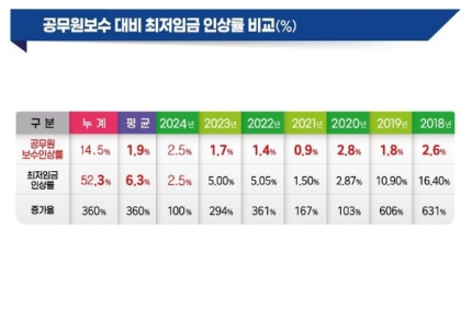 시위에 참여한 공무원들은 최근 젊은 공무원들이 낮은 임금에 불만을 토로하며 공직을 떠나고 있다고 입을 모았다. 공무원노조에 따르면 재직기간 5년 미만 공무원 퇴사자는 지난해 1만3500명을 넘어섰다. 최저임금 인상률은 2018년부터 매년 평균 6.3% 올랐는데 공무원 보수인상률은 연평균 1.9% 오르는 데 그쳤다는 설명이다. 공무원노조에 따르면 4년차 9급 공무원 실수령액은 194만8970원이다.